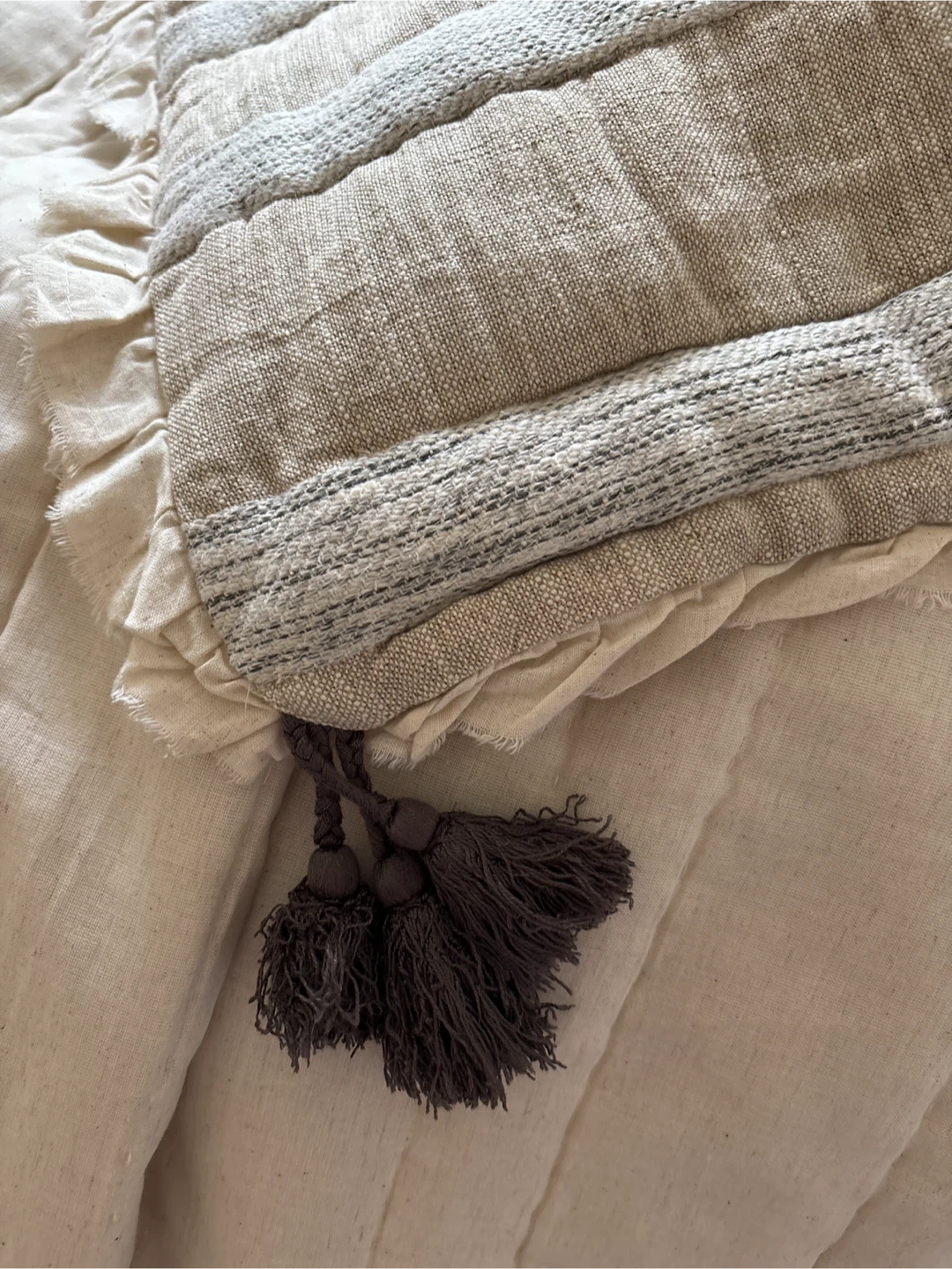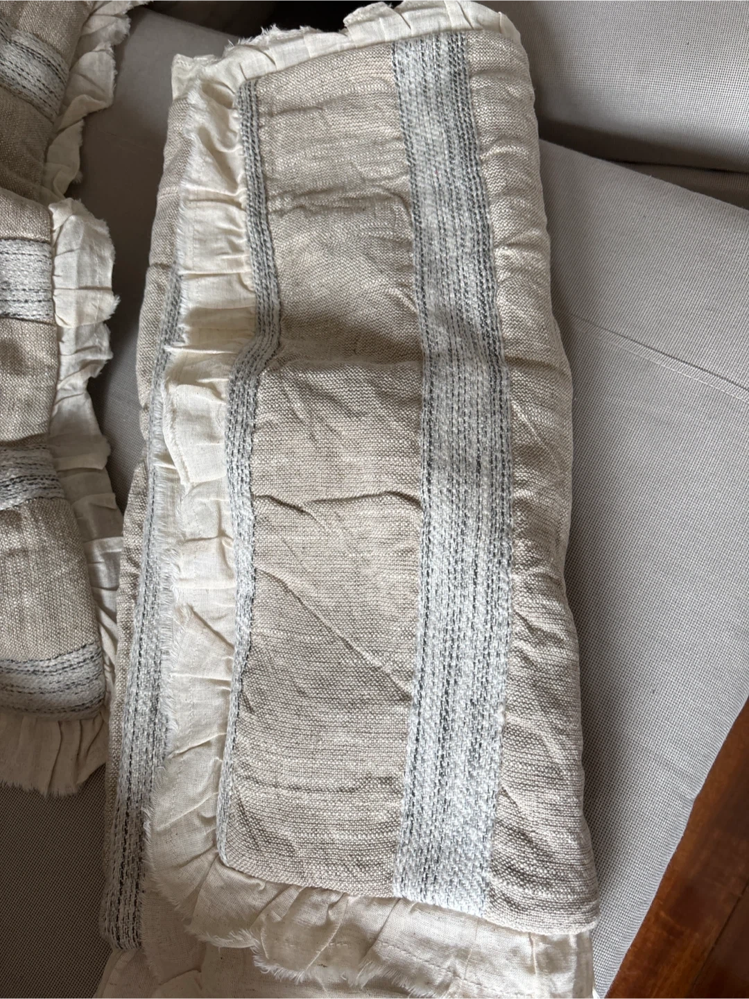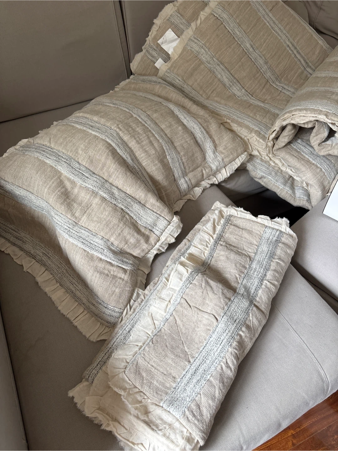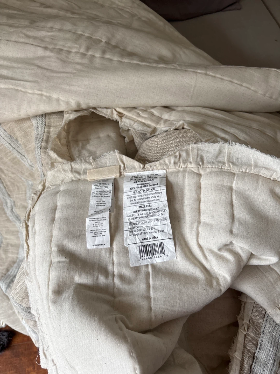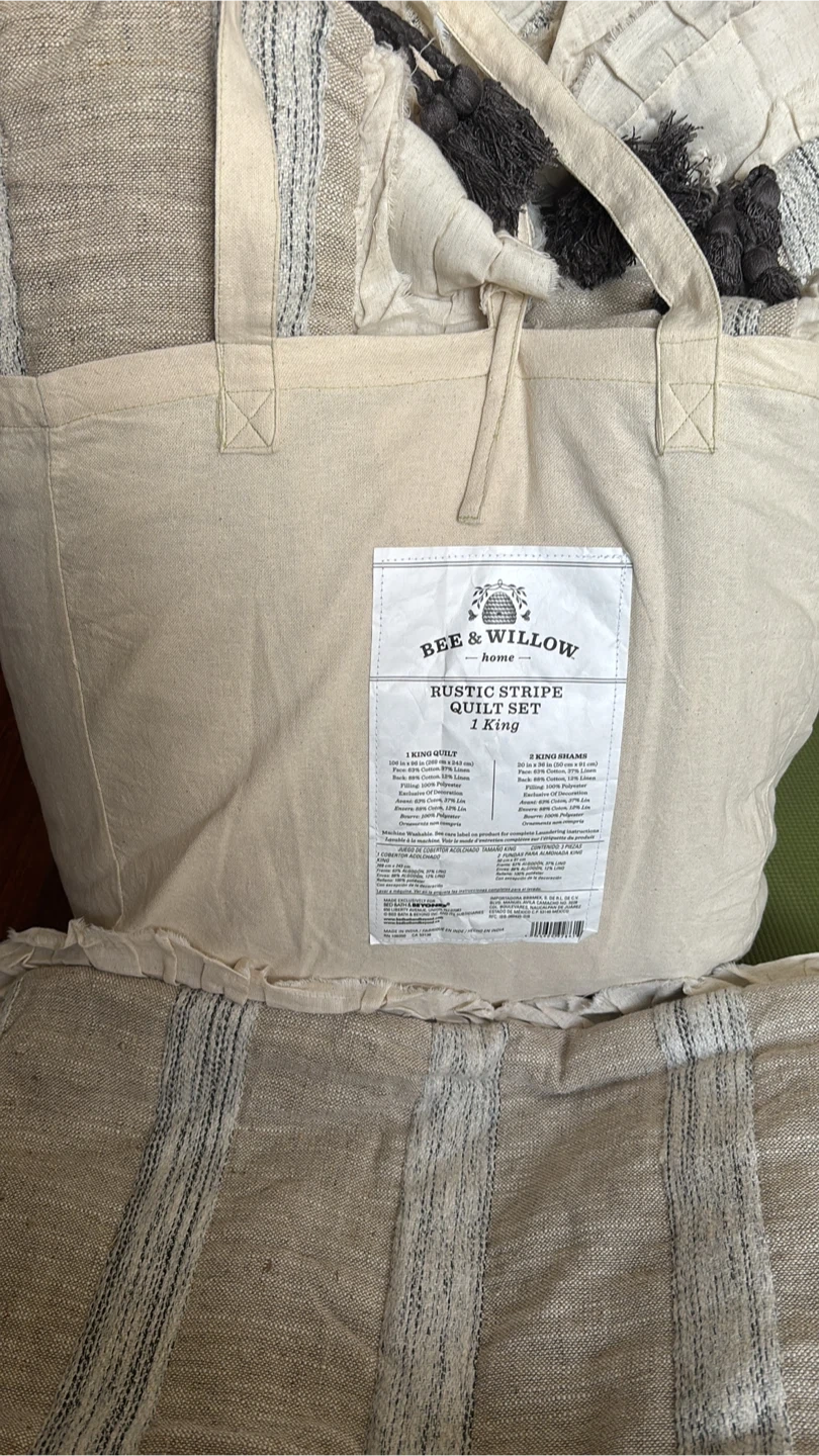 This Bee & Willow quilt set includes one king quilt and two king shams. The quilt is made from 80% cotton and 20% linen. Shams are 70% cotton, 20% linen, and 10% polyester. The set is machine washable. It's a great addition to any bedroom! I have 2 set of this. Pick upHarbour sq and Queens Quay.