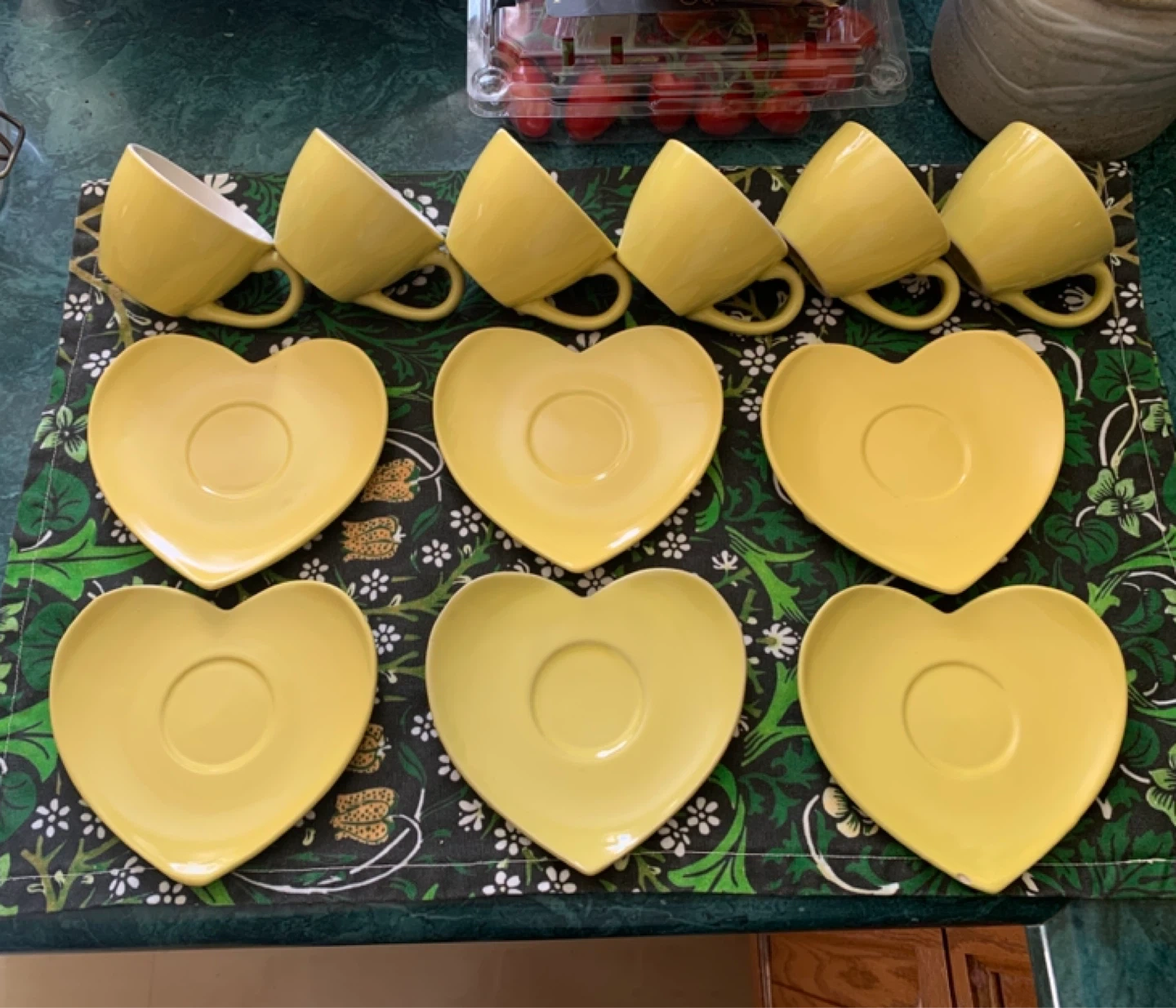 Really cute 6-piece espresso set with cups and matching heart-shaped plates. Would be perfect for summer parties! One plate has a minor chip as pictured