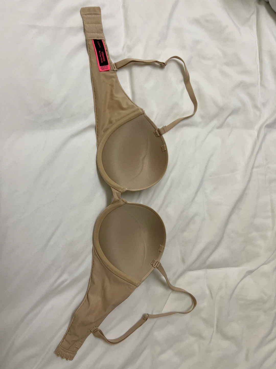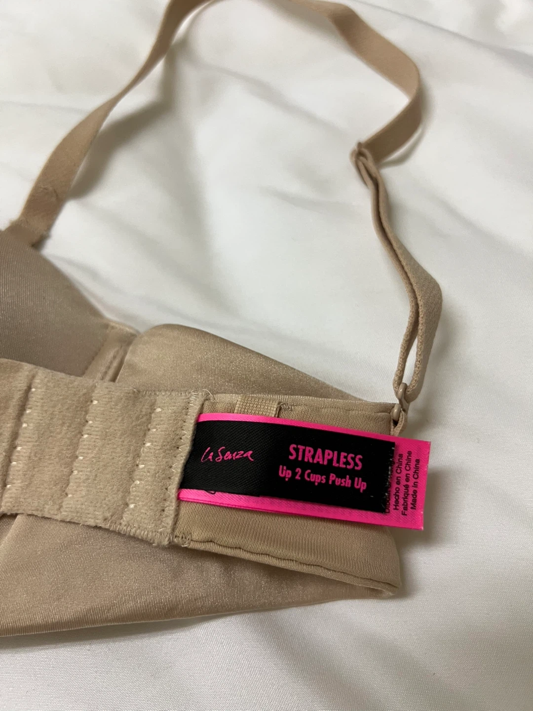 3 double push-up bras from La Senza. All sized 32C with adjustable straps and a hook-and-eye closure. Featuring a black seamless bra and a strapless nude bra that offers a smooth and supportive fit under strapless dresses. The third bra is a nice light teal lace bra. All bras are in excellent condition.
