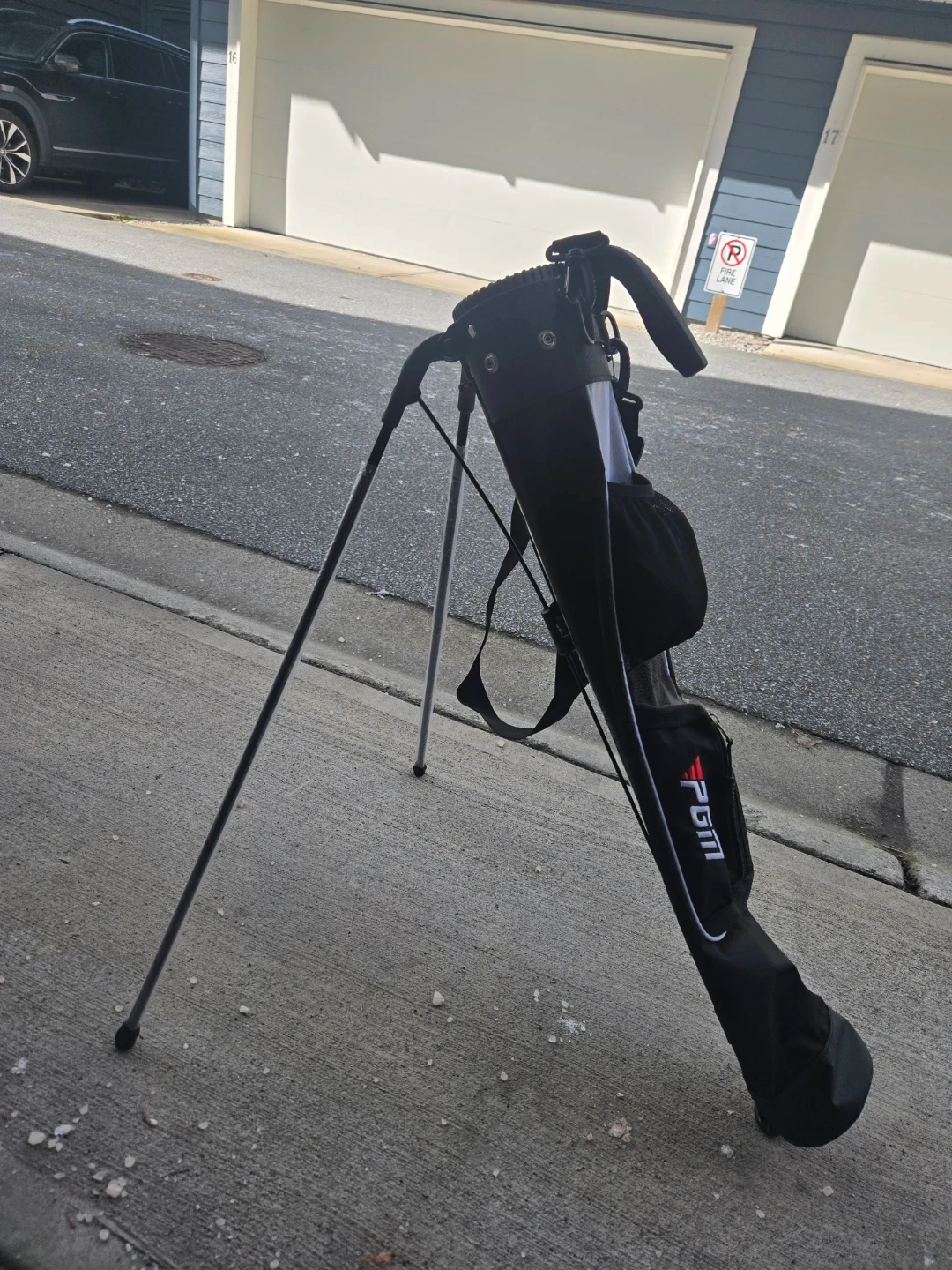 This is a black PGM golf stand bag. It features a lightweight design and a durable strap for easy carrying. It's perfect for carrying your golf clubs to the drivinv range and par 3 course.