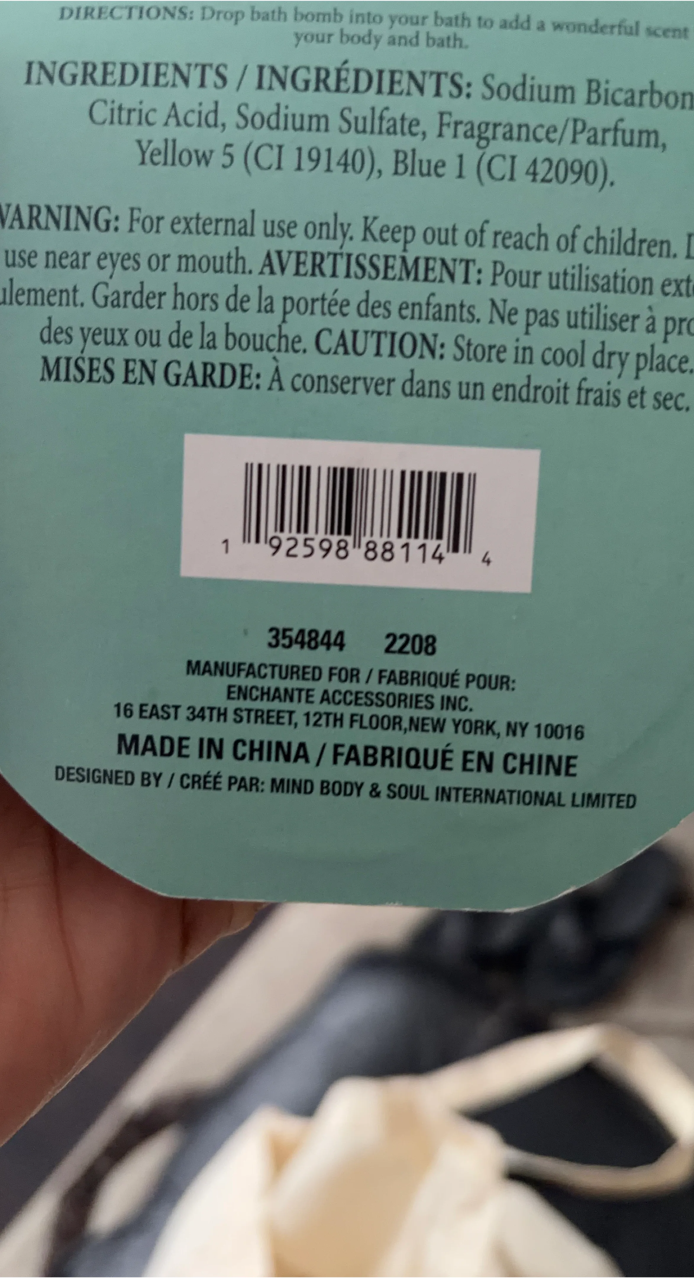 Drop bath bomb into your bath to add a wonderful scent to your body and bath. It's made with Citric Acid, Sodium Sulfate, Fragrance/Parfum, Yellow 5, and Blue 1. Keep out of reach of children and store in a cool, dry place.