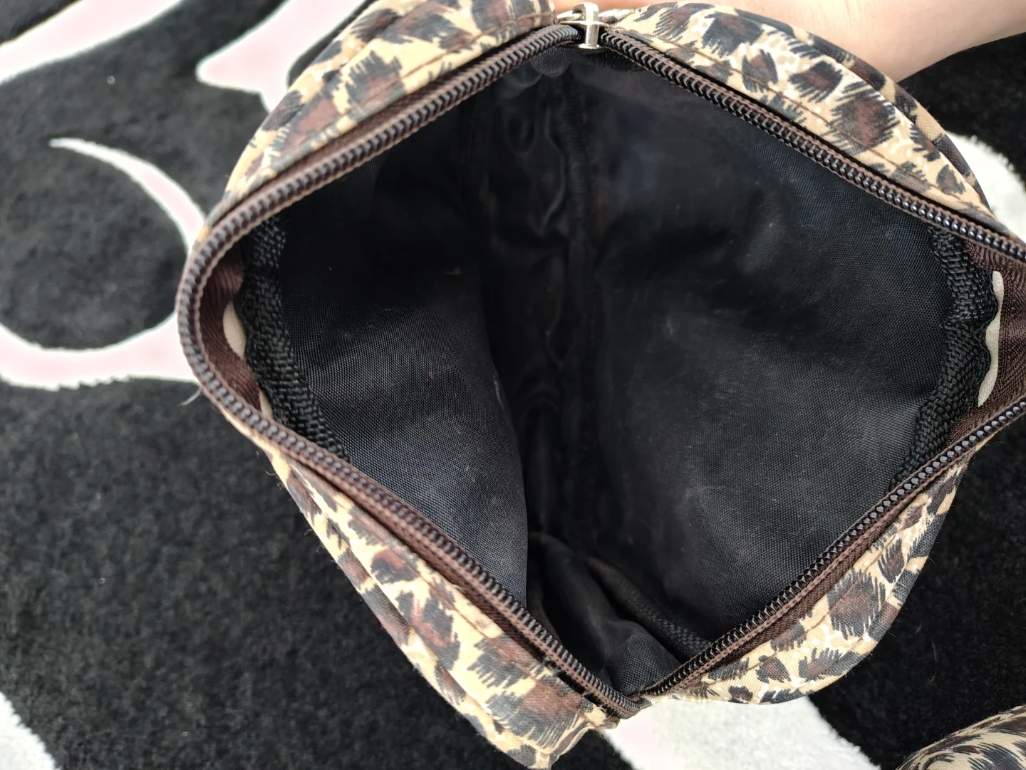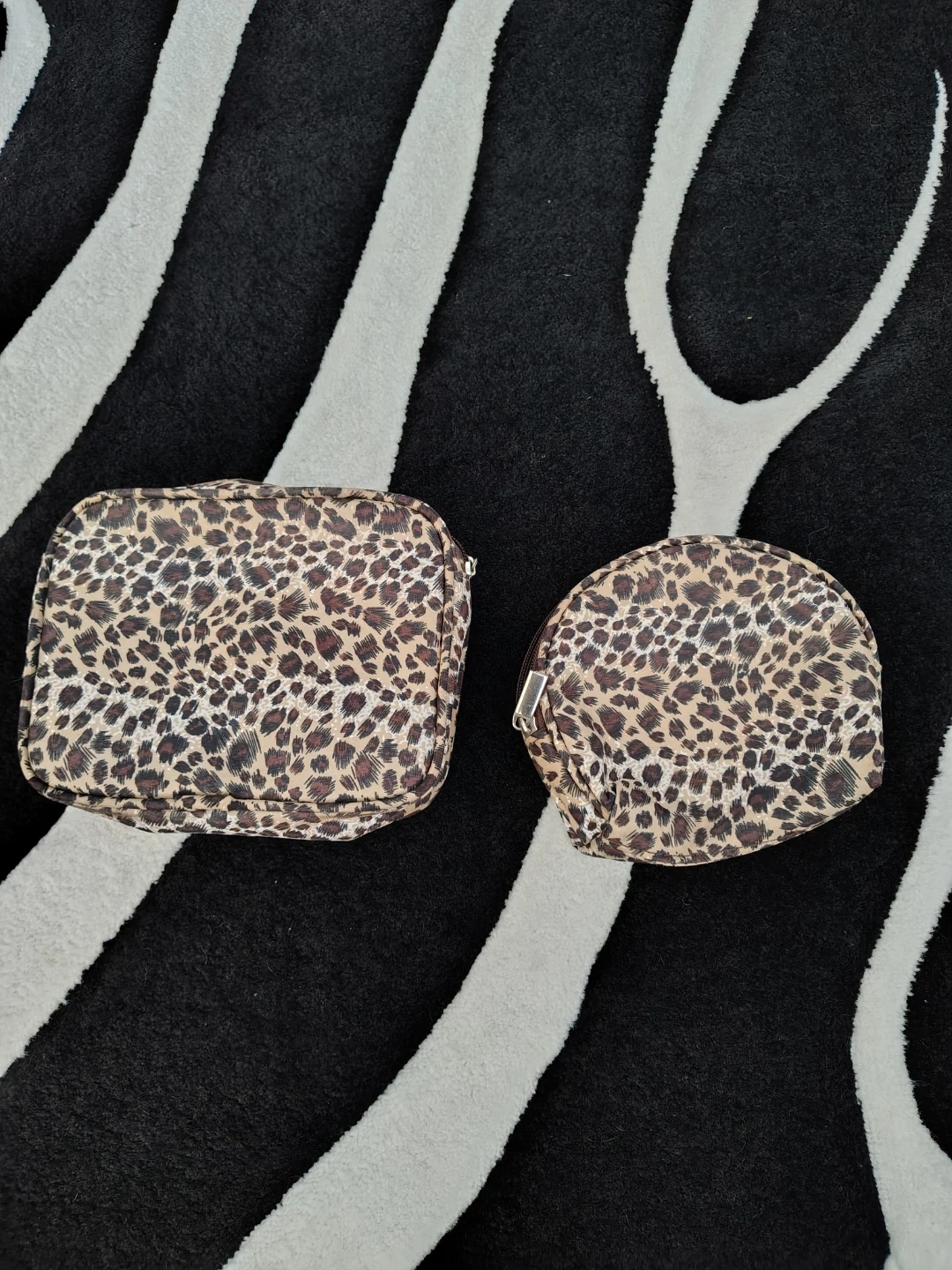 Two leopard print cosmetic bags. Includes a larger rectangular bag and a smaller round pouch. Perfect for organizing makeup and toiletries!