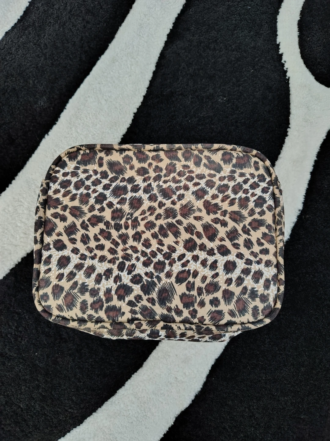 Two leopard print cosmetic bags. Includes a larger rectangular bag and a smaller round pouch. Perfect for organizing makeup and toiletries!