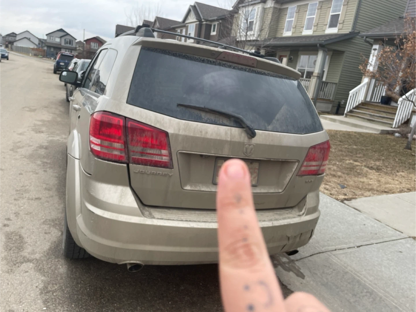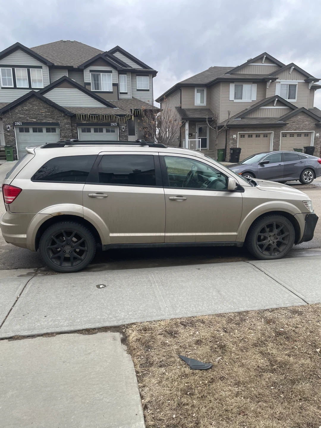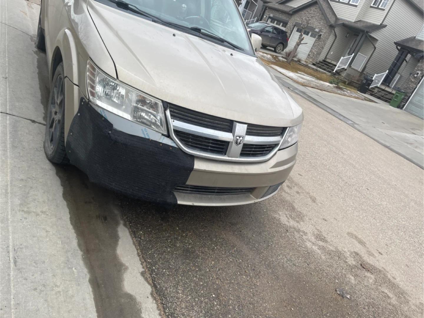 Dodge Journey SUV in a champagne colour. It's a 4-door vehicle with roof racks. Sold as-is, front bumper has custom material covering.