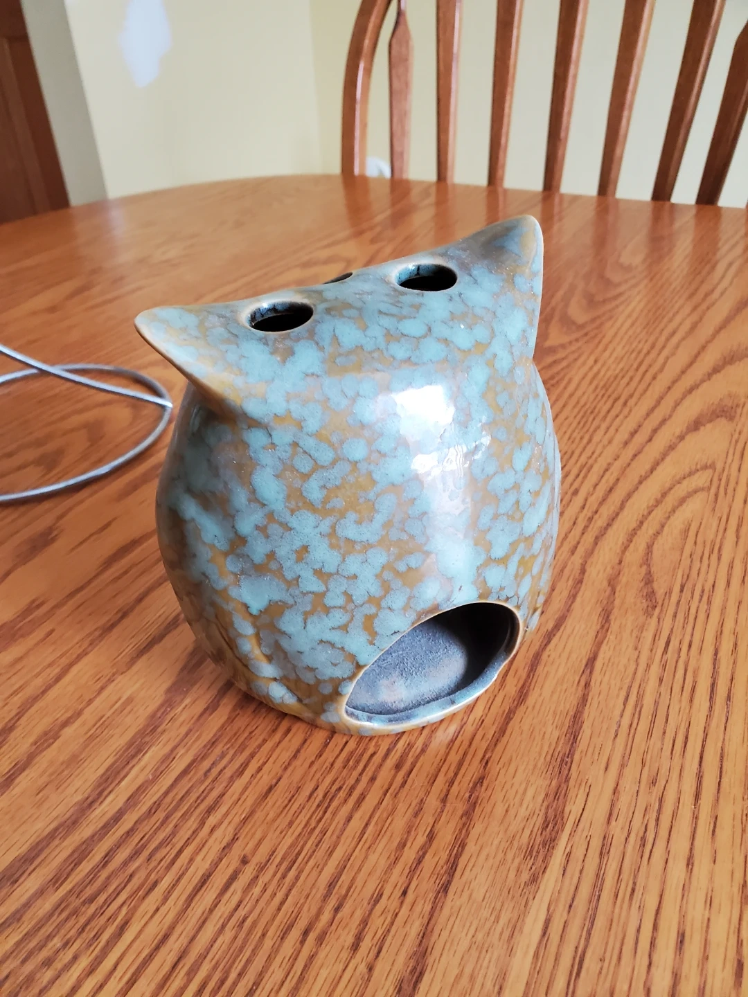 Cute ceramic owl holder with a blue-green speckled glaze. It has multiple holes on the top and front, suitable for holding pens or small items. The opening on the front allows for ventilation. This decorative piece adds a touch of whimsy to any desk or shelf!