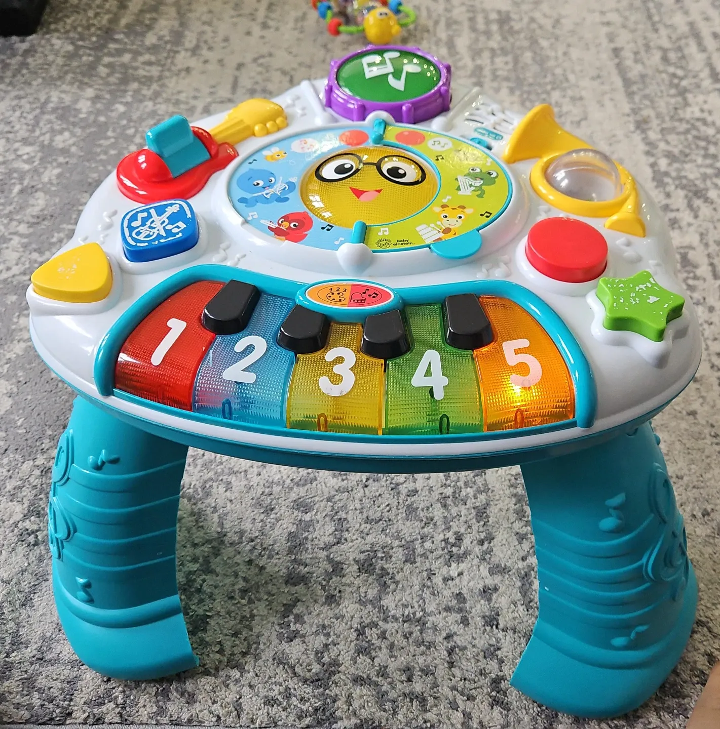 This Baby Einstein activity table has colourful keys with numbers 1-5 and various musical instruments. It's designed for little ones to explore sounds and music. Great for early development and sensory play!