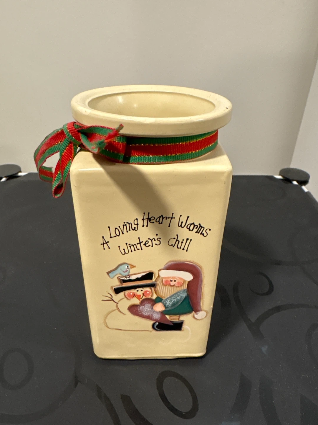 This cream-coloured vase features a festive Christmas design with a snowman and Santa. It's decorated with the text "A Loving Heart Warms Winter's Chill" and has a red and green ribbon tied around the top. The vase is ceramic and suitable for holding flowers.