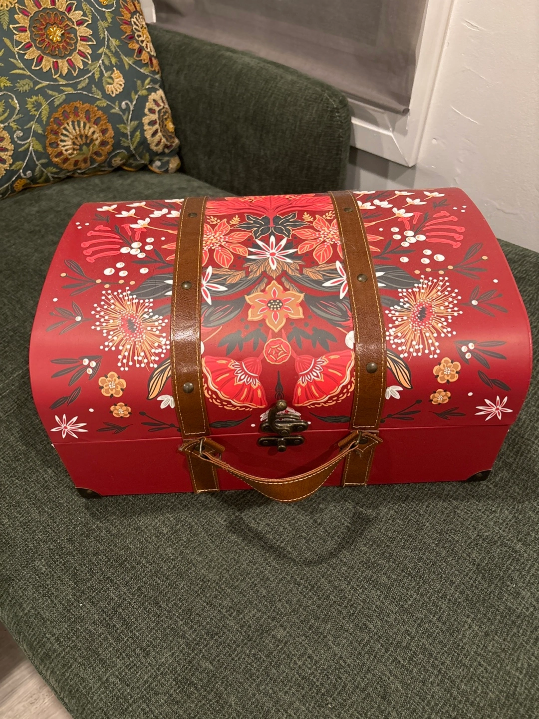 Beautiful decorative trunk. Red with floral print. Brown leatherette accents. Perfect for storage or display. Medium size.