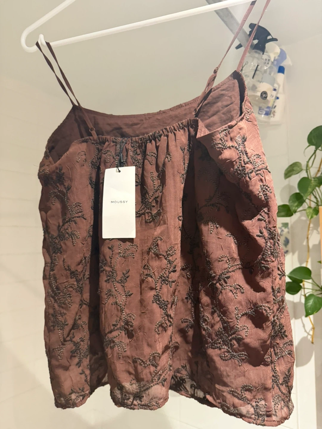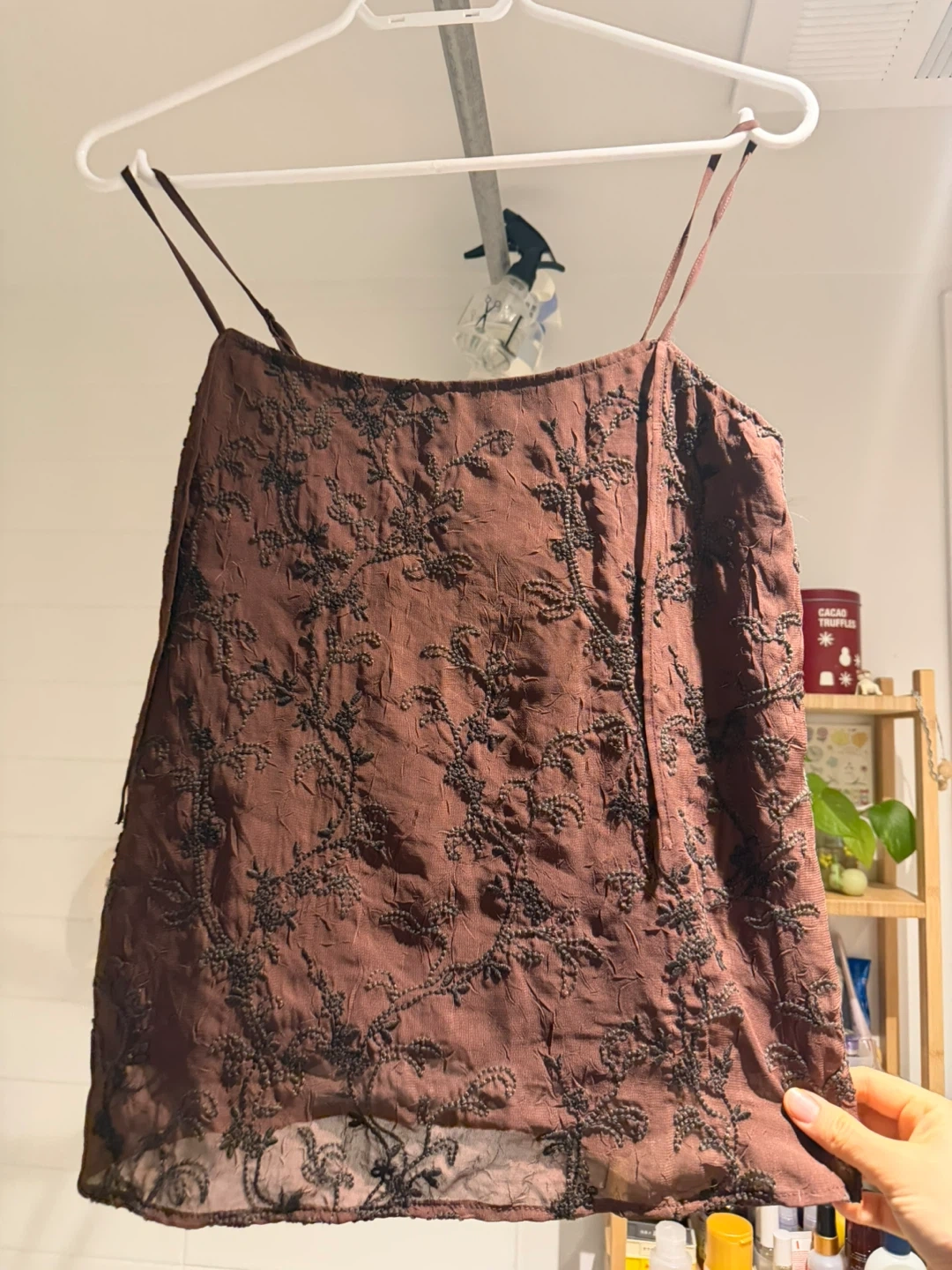 Brown camisole top with delicate black embroidery throughout. Thin adjustable straps. Sheer hemline detail. Looks great with jeans or a skirt!