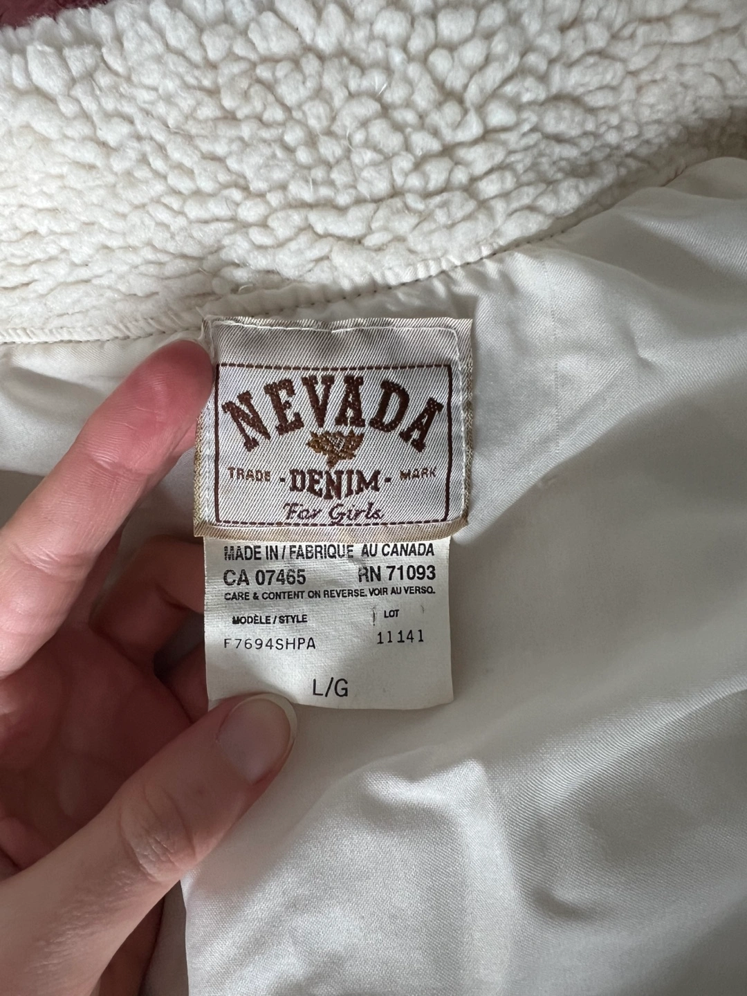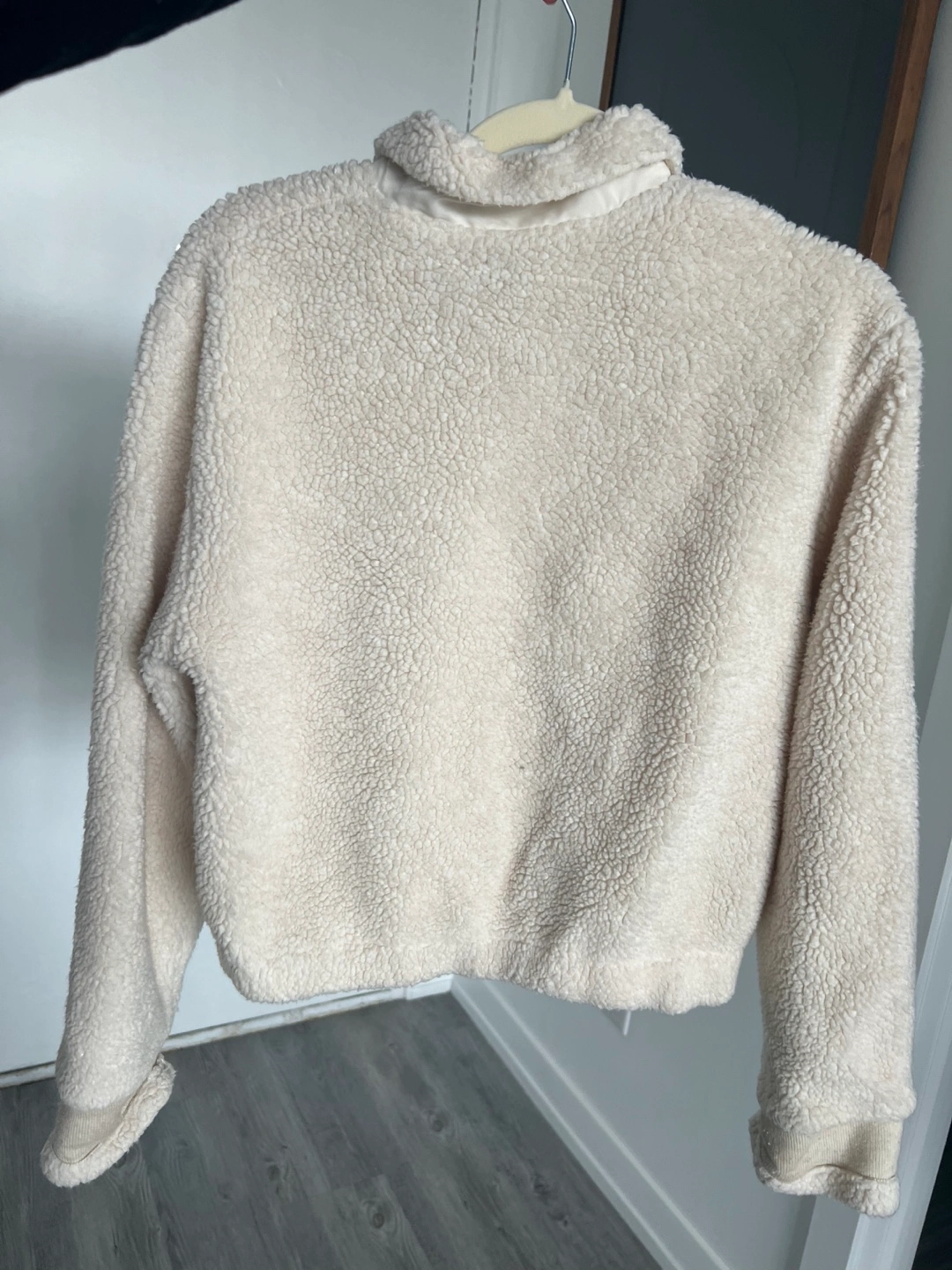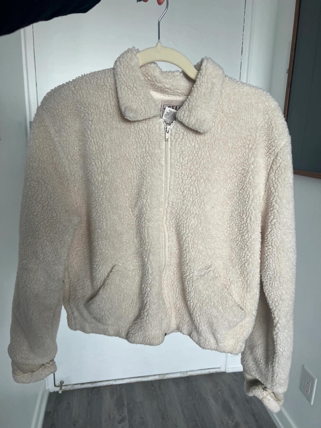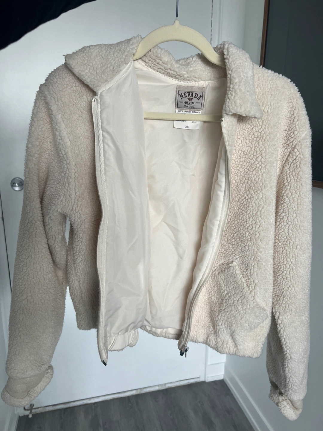 Cream-coloured sherpa jacket. Zip-up closure. Long sleeves with ribbed cuffs. Cropped length. Size L but fits S.