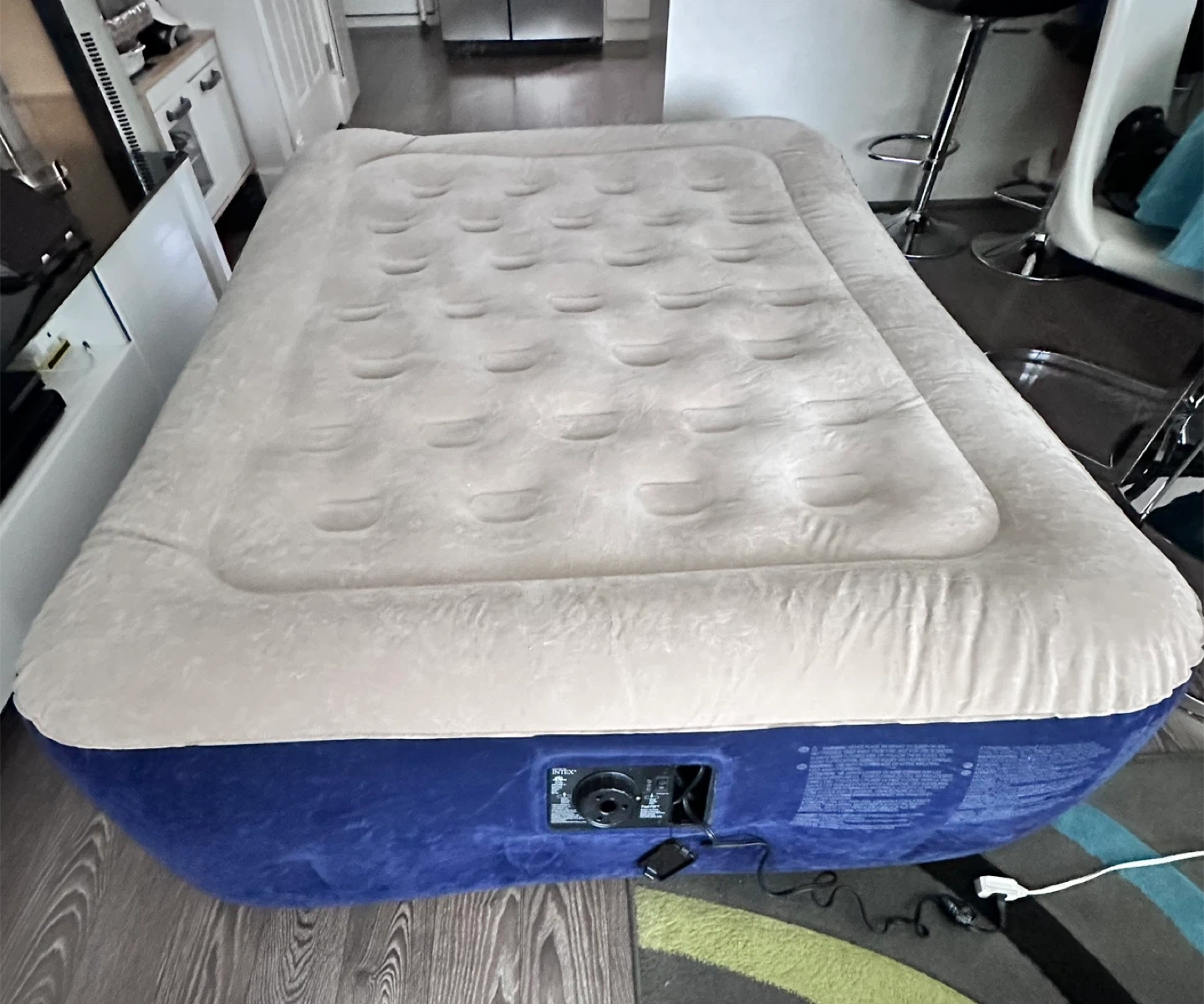 Double sized air mattress from INTEX. Features an integrated Fast-Fill electric pump for easy inflation and deflation. Constructed with durable materials for comfort. Includes the pump and power cord.