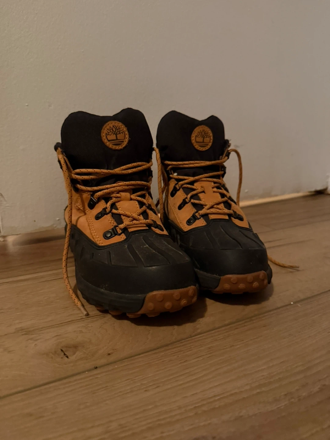 Timberland boys' waterproof boots in a tan and black colourway. These boots are size 6.5 US, 6 UK, 39.5 EU, 24.5 MX, 24.5 CN. They're made in Cambodia. Perfect for keeping little feet dry in wet weather!
