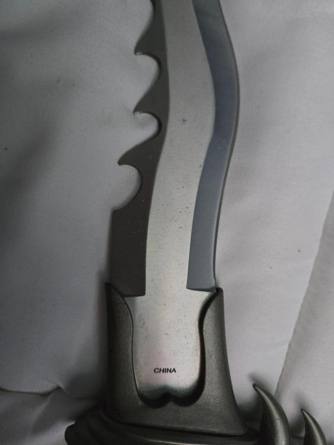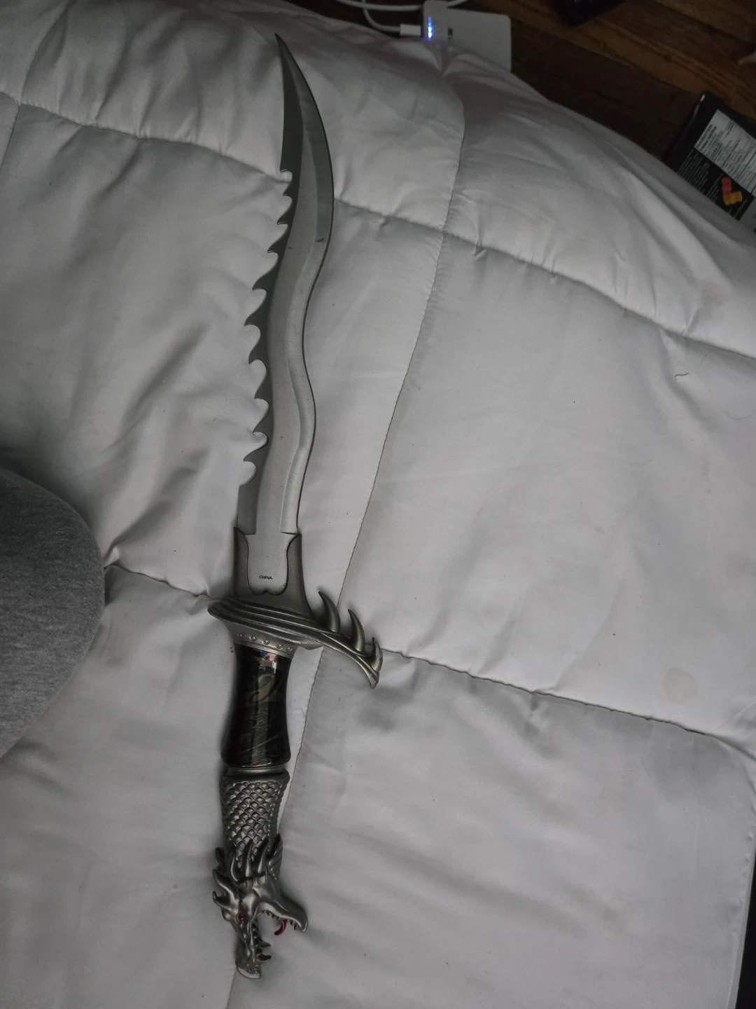 Cool decorative dagger featuring a dragon head pommel and a serrated blade. It's made in China and its metal construction gives it a substantial feel. This item would make a neat display piece for fantasy or gaming enthusiasts!