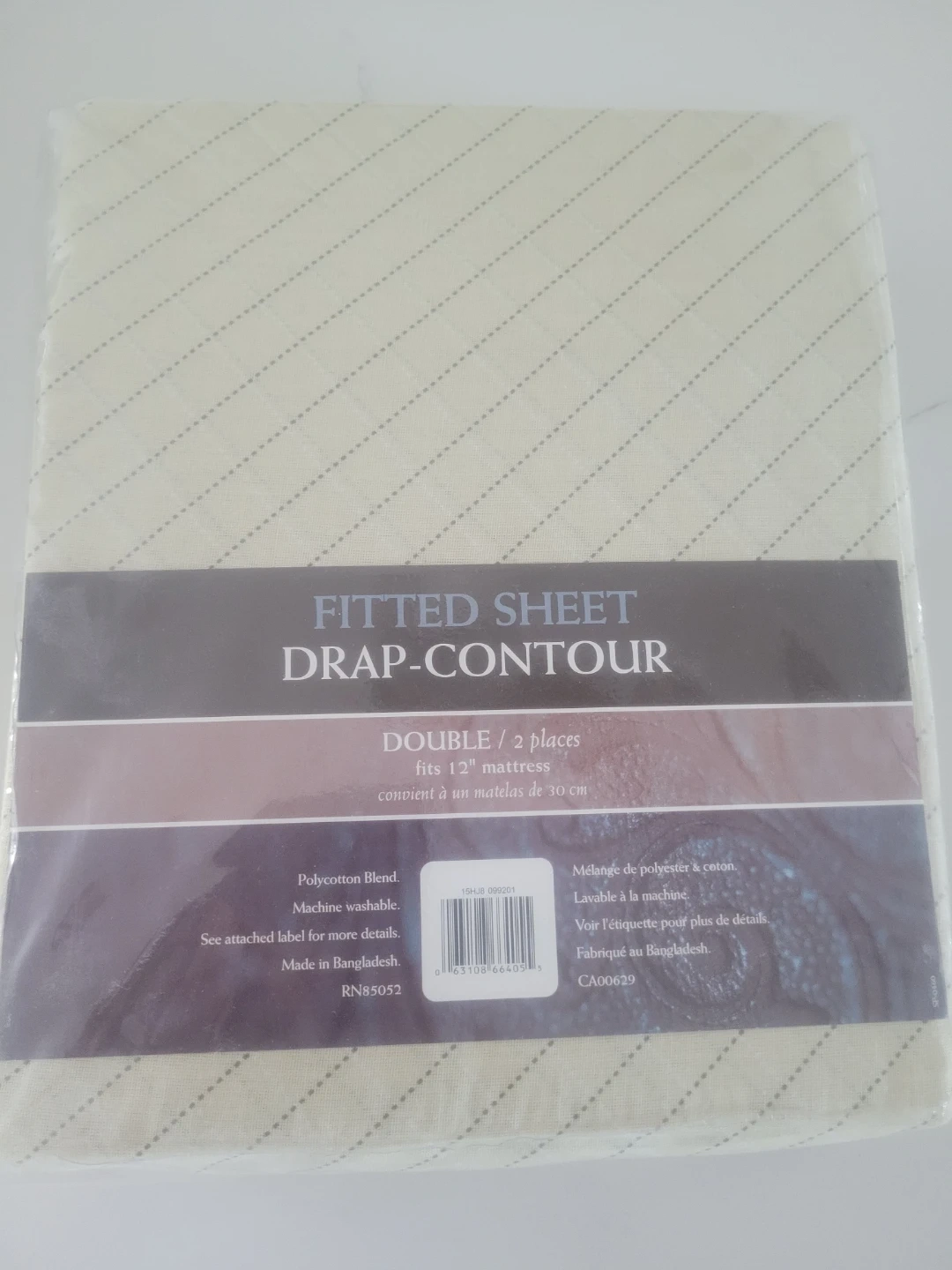 This fitted sheet is a double size, designed to fit a 12" mattress. It's made from a polycotton blend and is machine washable. It was made in Bangladesh.