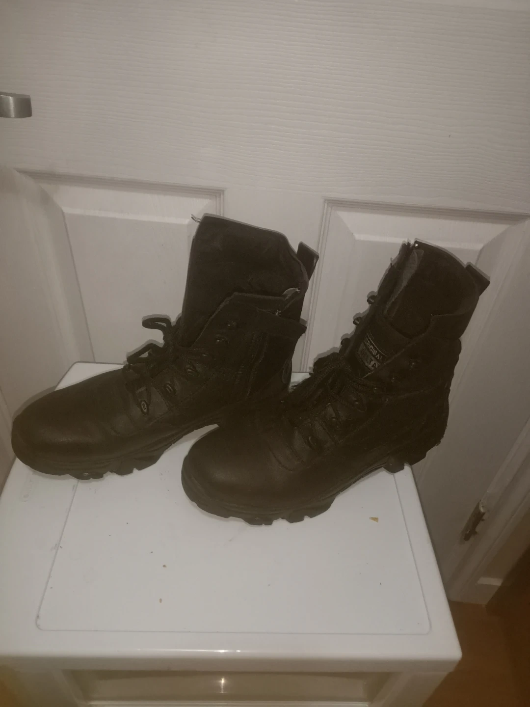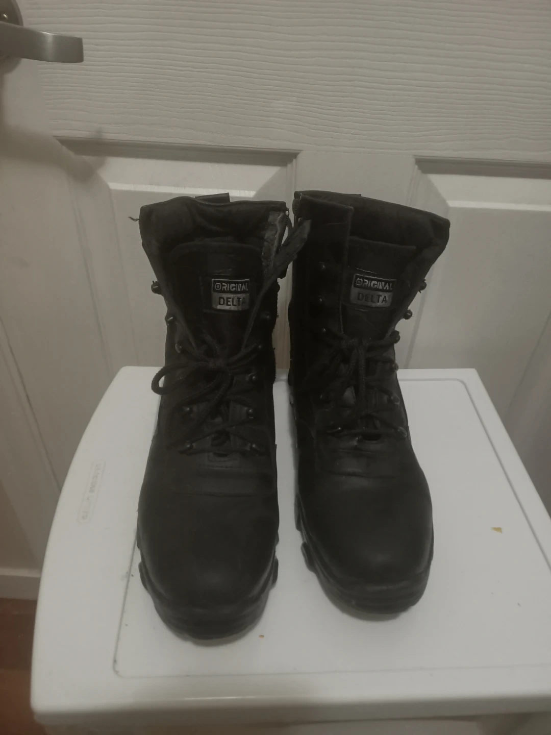 Original Delta combat boots in black. Lace-up closure with side zippers. Durable sole for traction. These boots are suitable for work or outdoor activities. Like new