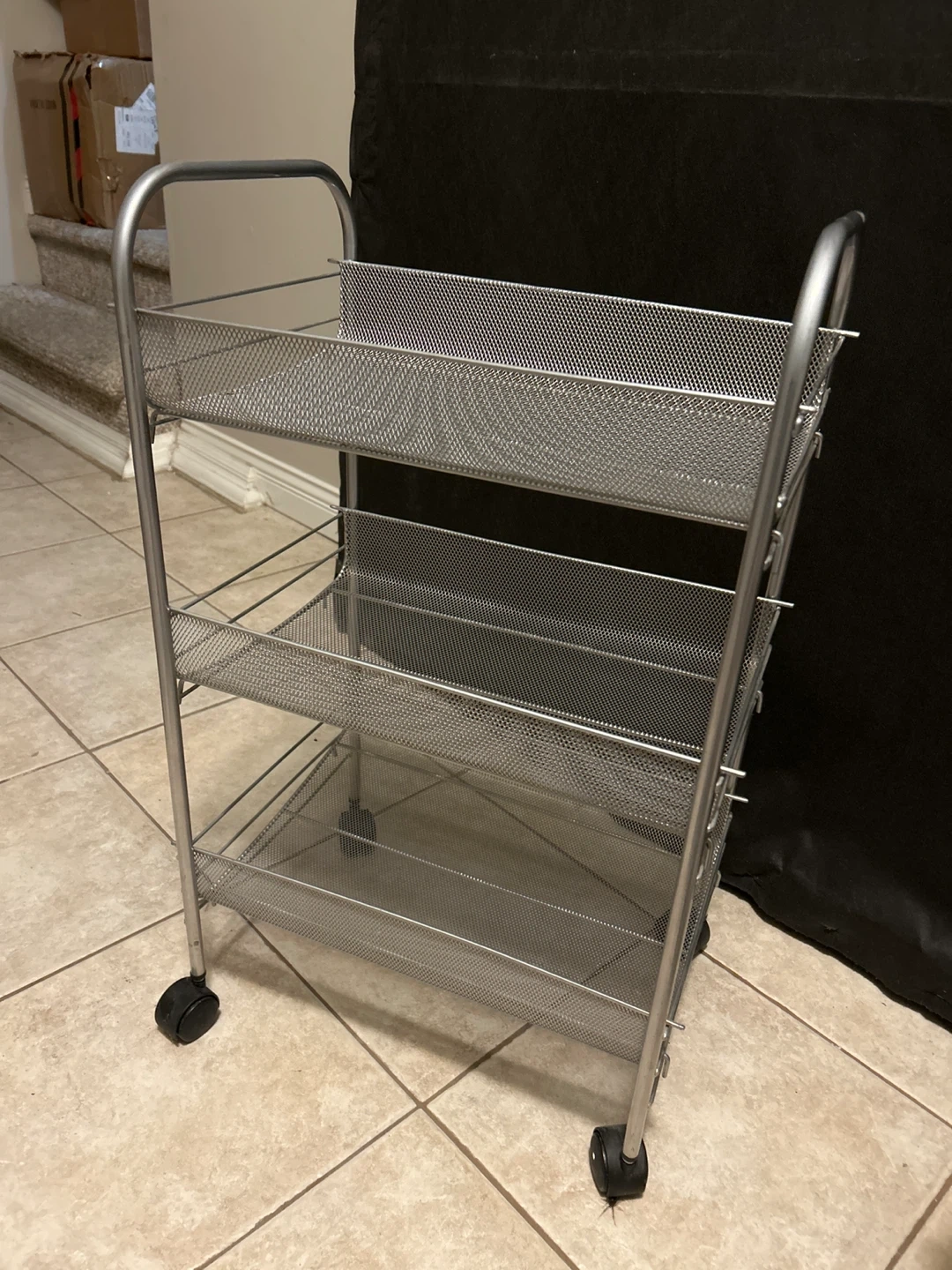 This silver mesh cart has three tiers for storage. It rolls easily on four wheels and is made of metal. Great for organizing various items around the house!