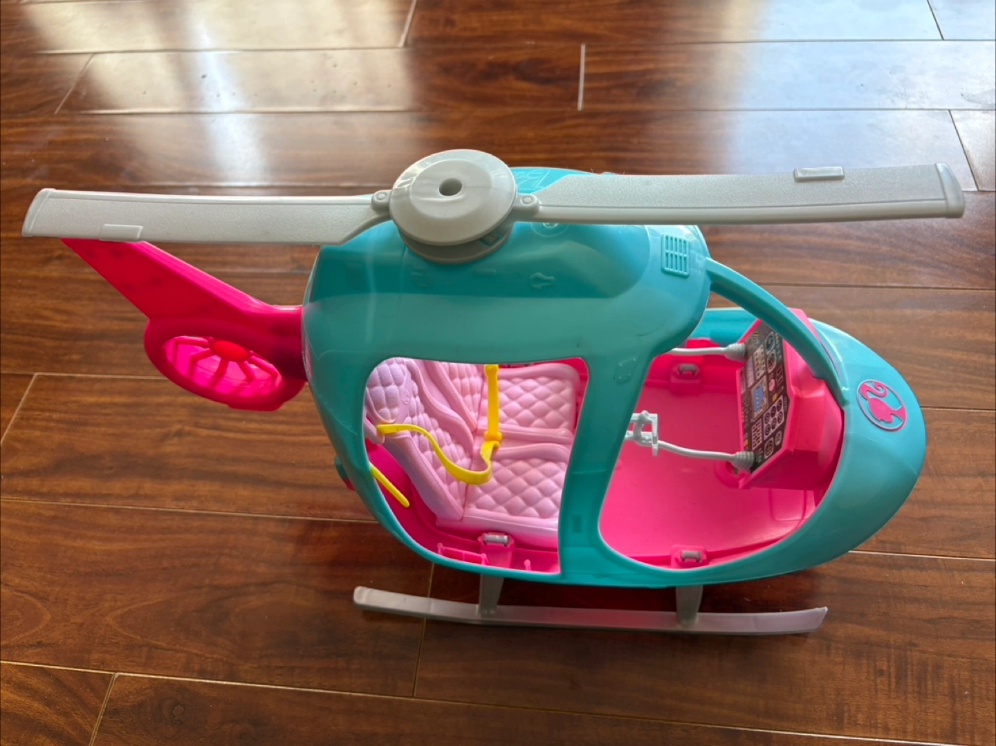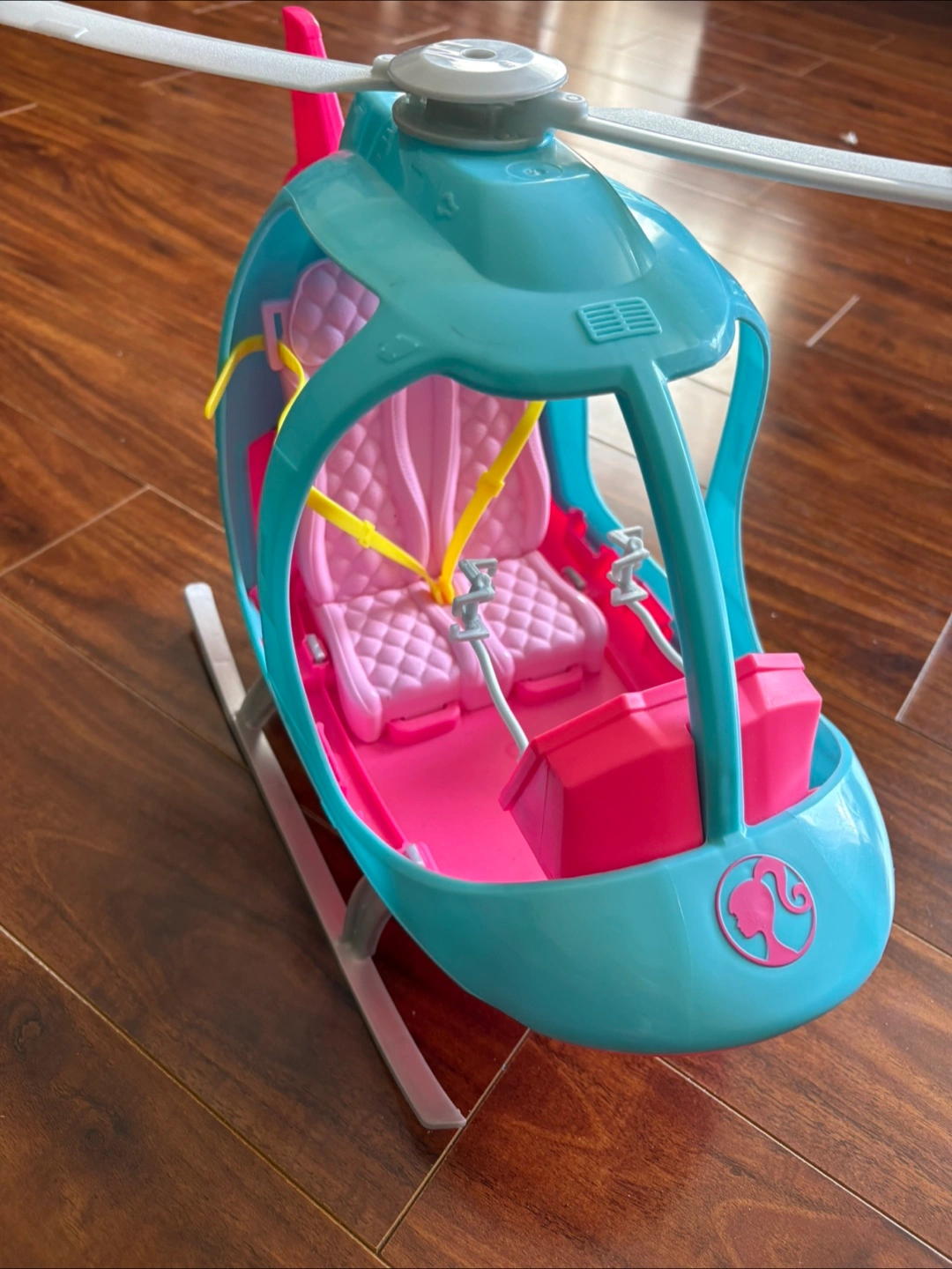 Selling a Barbie helicopter toy in great condition! It's perfect for imaginative play and Barbie adventures. This helicopter is pink, teal, and white with seating for two dolls.