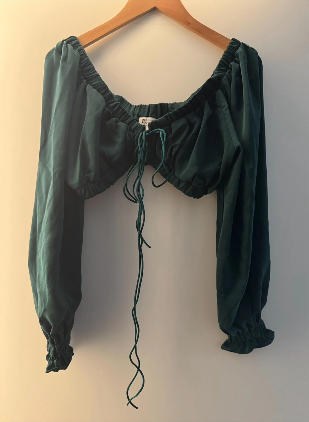 Bought from an independent boutique in Ottawa. Lovely teal colour, very flattering with front ties to adjust fit. Cropped fit. Can be worn on or off shoulder. Great condition, basically new.