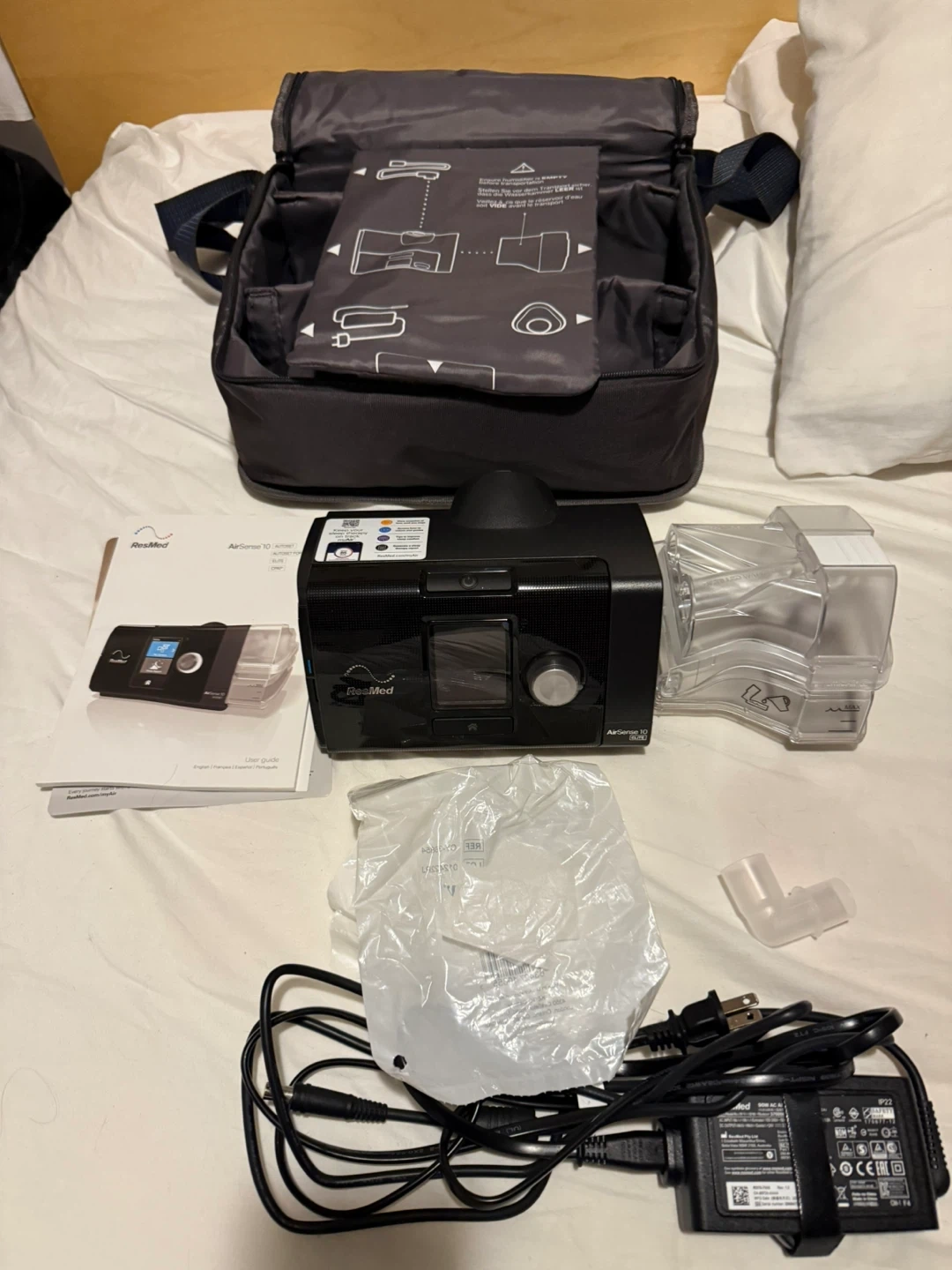 This ResMed AirSense 10 Autoset CPAP machine comes with a travel bag and a quick start guide. It's designed for sleep therapy and includes the main unit, humidifier, power adapter, and various accessories. This setup is great for use at home or while travelling.