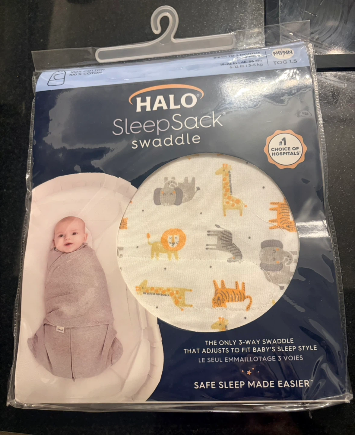 This HALO SleepSack swaddle is made of 100% cotton and is sized for newborns to 3 months, fitting babies 6-12 lbs. It's designed as a 3-way swaddle to adjust to your baby's sleep style. Safe sleep made easier!