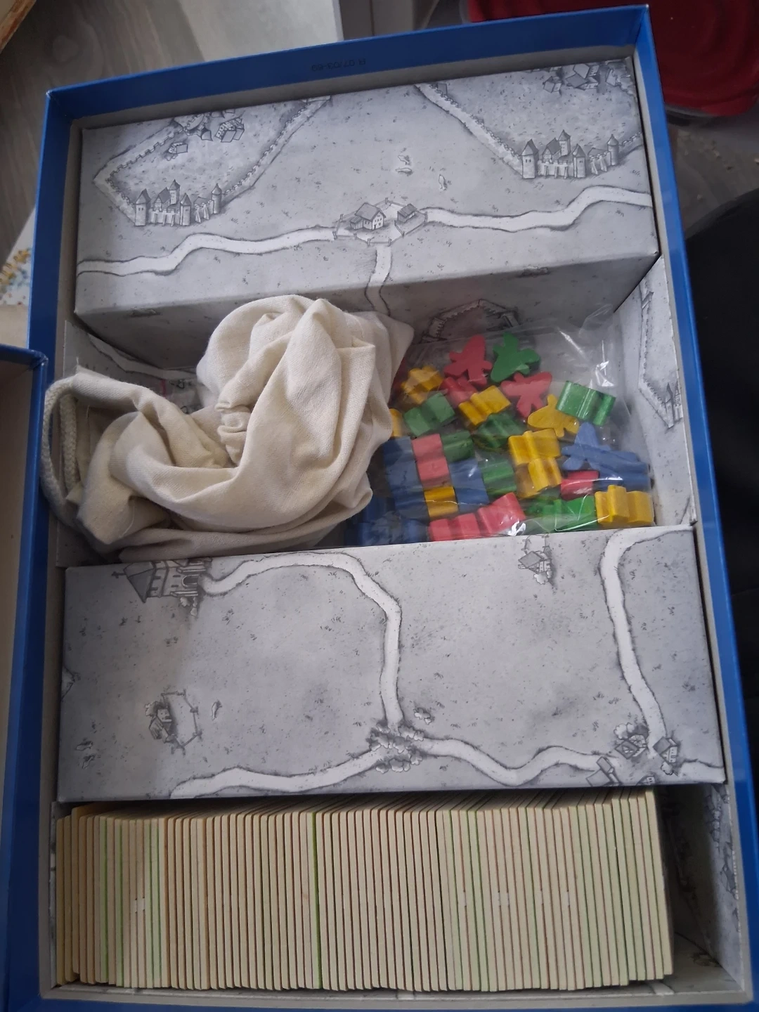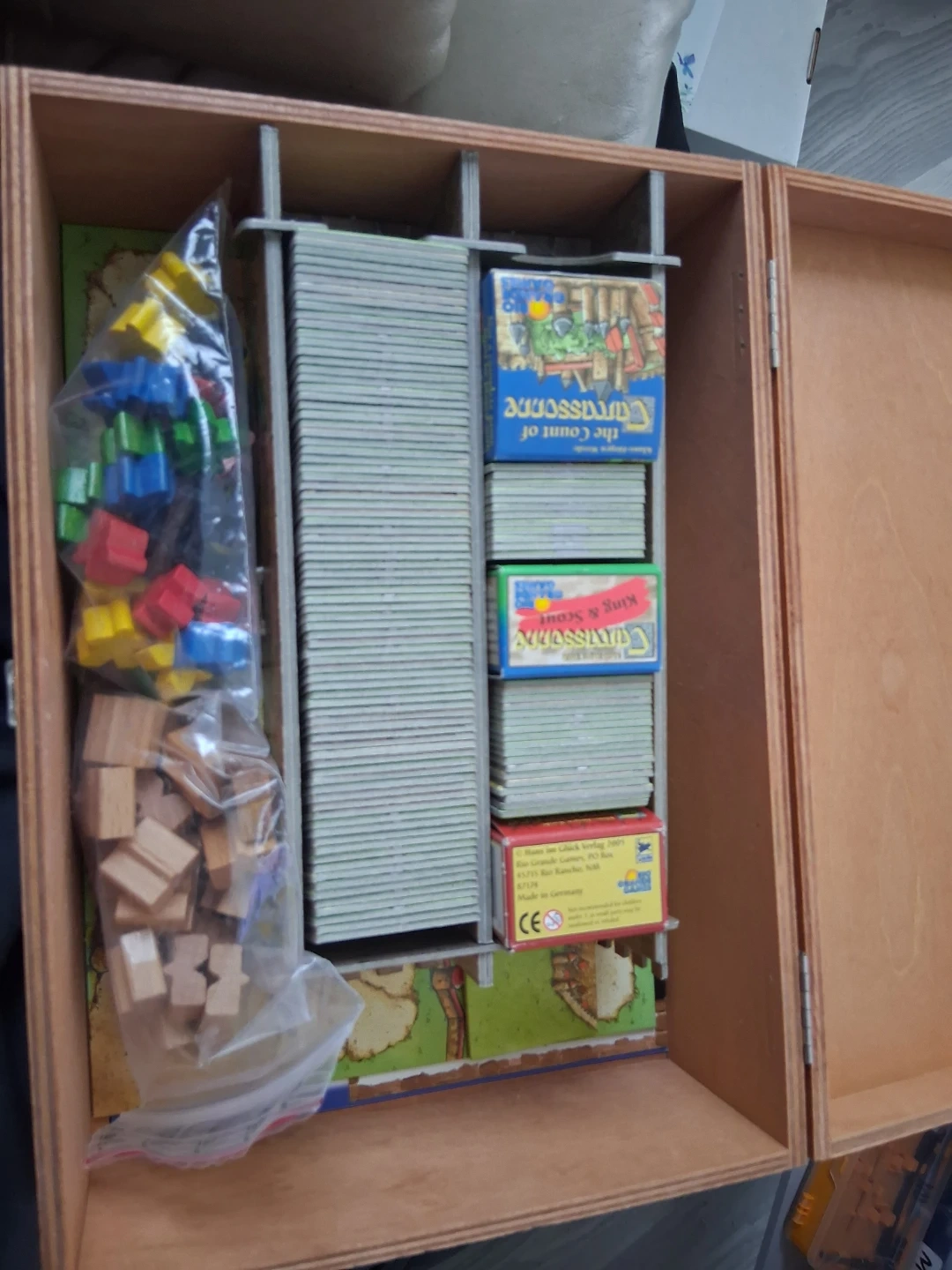 This is the original Carcassonne board game by Klaus-Jürgen Wrede. It includes the base game along with several expansions like Inns & Cathedrals, Traders & Builders, The Princess & The Dragon, and The Tower. The wooden box version keeps everything organized. It's great for strategy game nights!