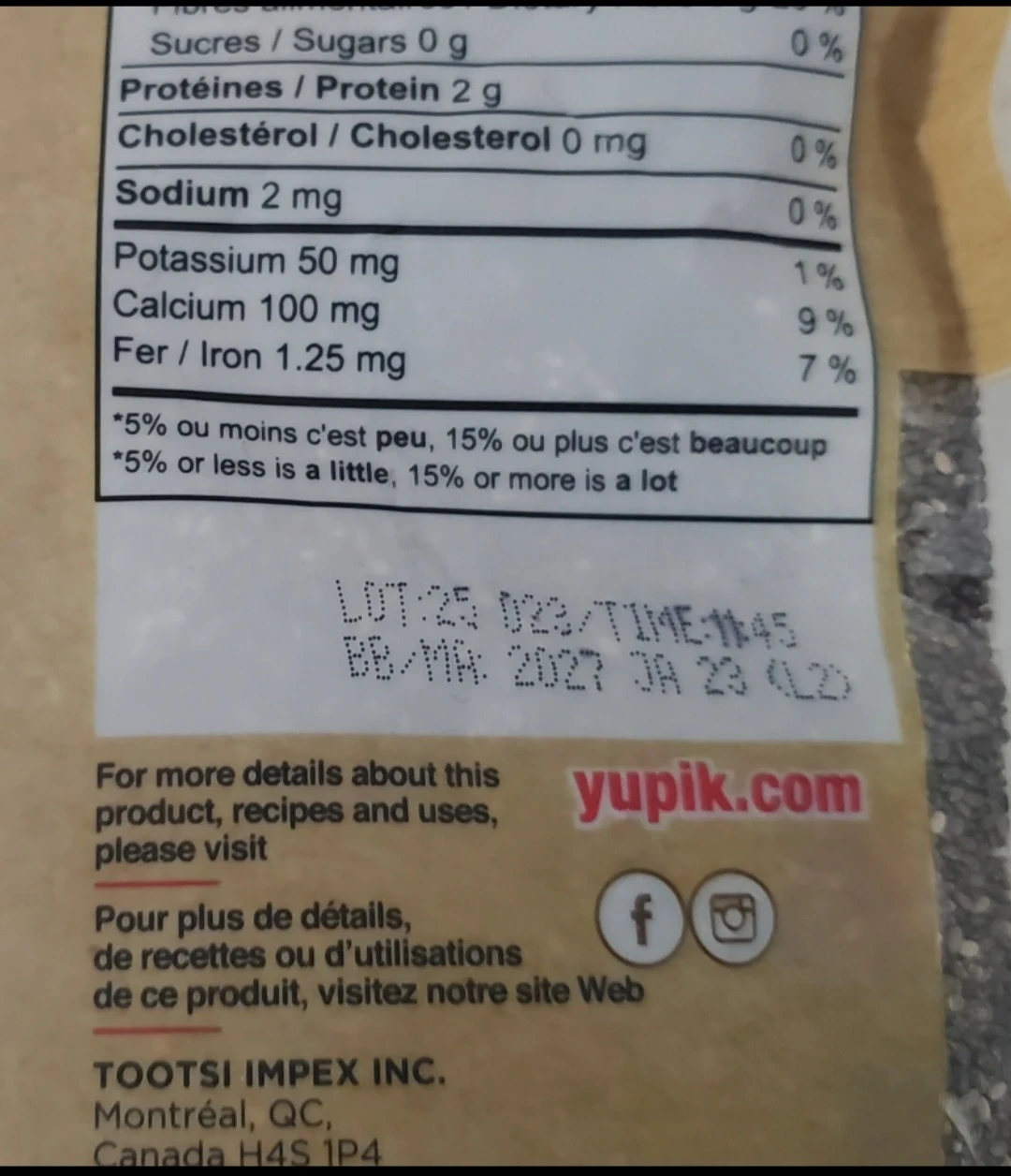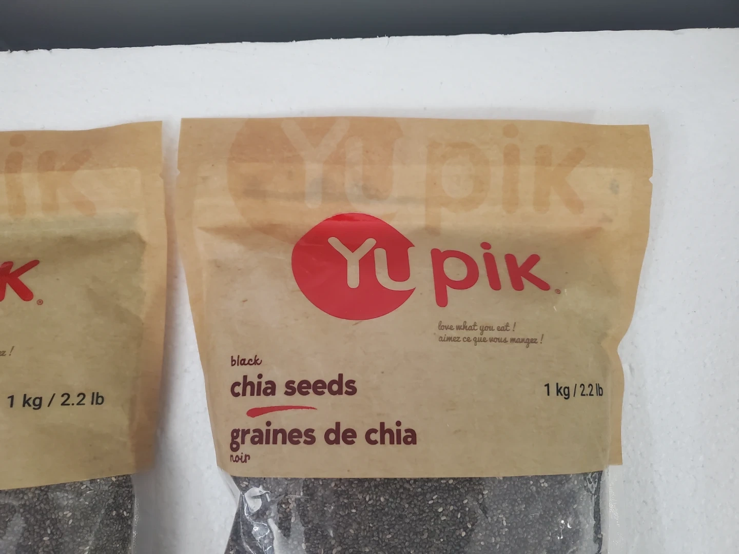 Yupik black chia seeds, 1 kg per bag. These seeds are a good source of fibre and protein. They're great for adding to smoothies or yogurt.