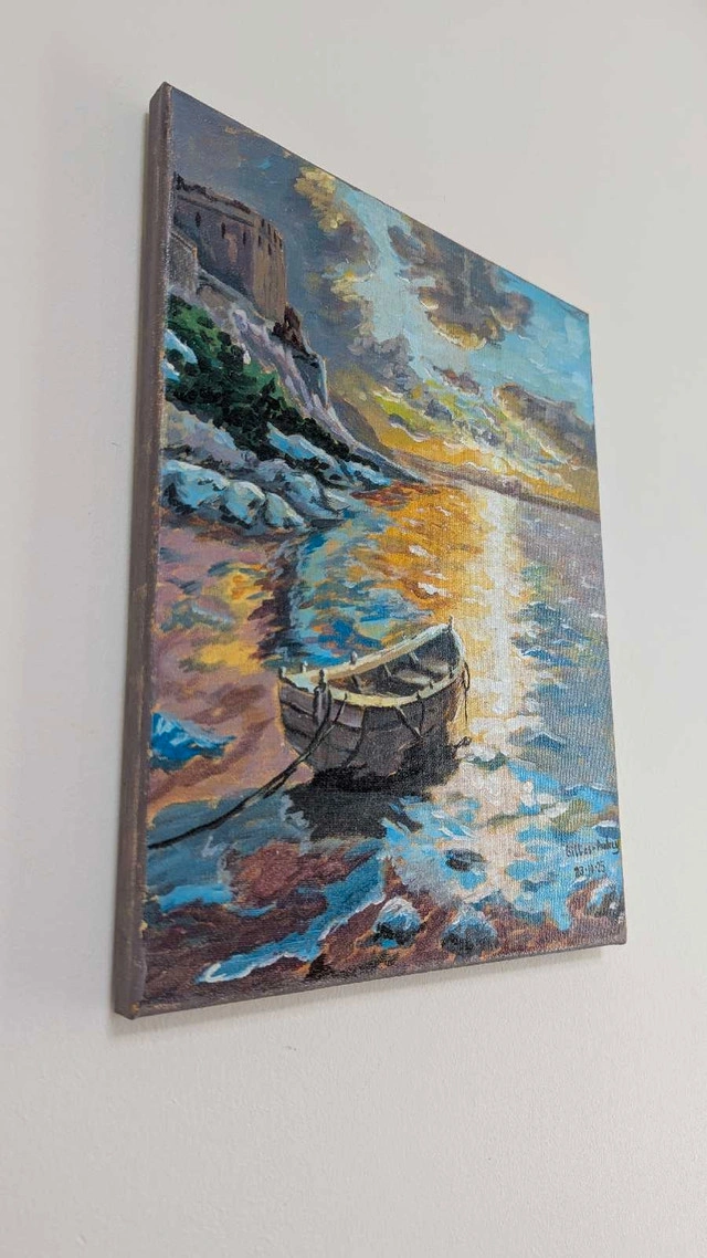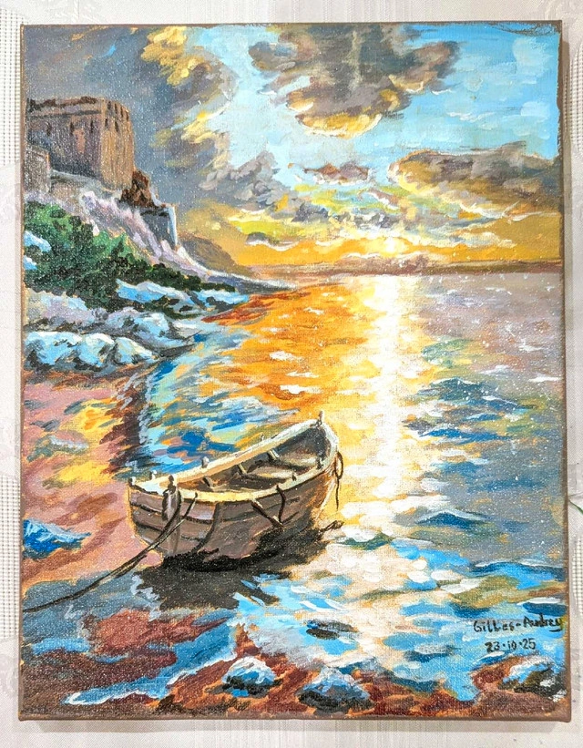 10Impressionistic painting of a warm sunrise painted on a 11in X 14in canvas. Ready to Display: Signed and dated by the artist (Gilles-Audrey, 23.10.25). Perfect size for any room. Bring this dramatic light and coastal tranquility home!