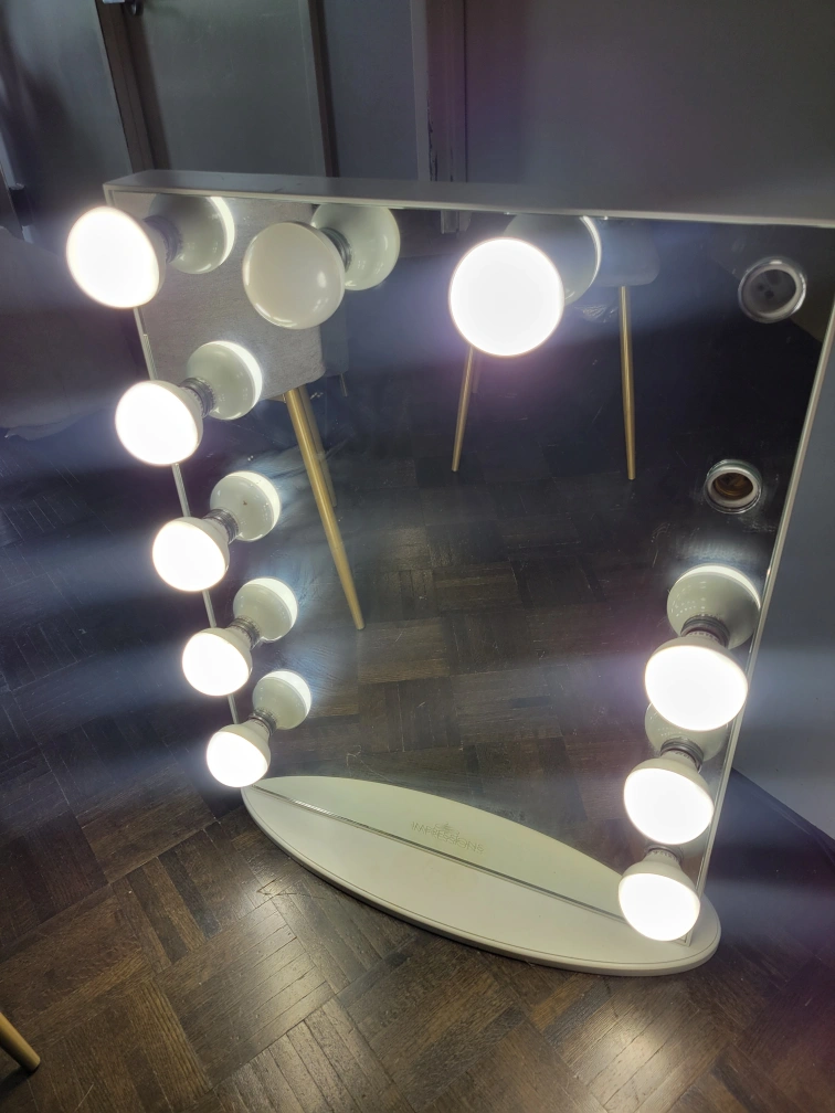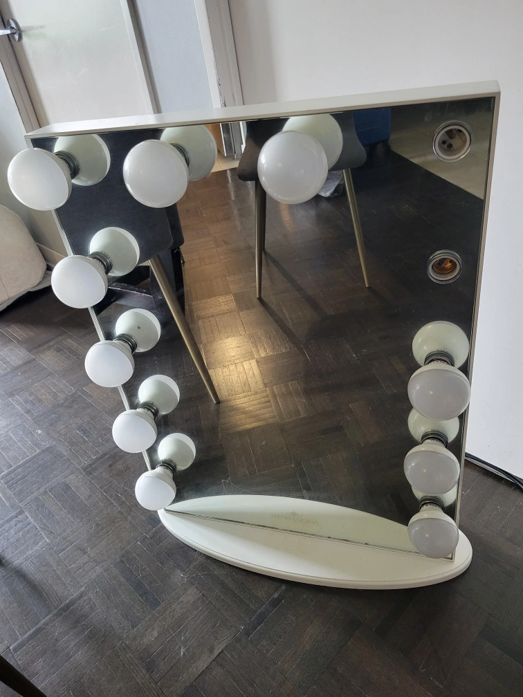 99A rectangular vanity mirror. Features several light fixtures surrounding the frame. The base is a rounded shape, complementing the rectangular mirror. This is perfect for anyone who wants to easily get ready in a relaxing atmosphere. 2 sockets do not work.