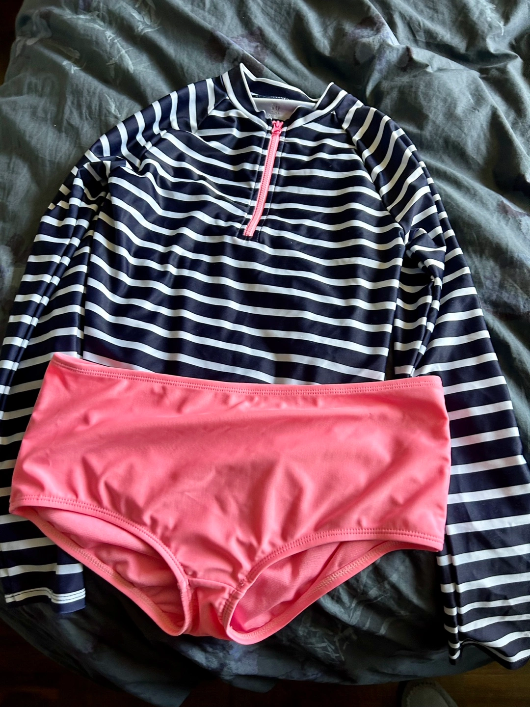 Long-sleeved rash guard with navy and white stripes, pink bikini bottom. Zip up front on the rash guard. Gap size xxl. Great suit!