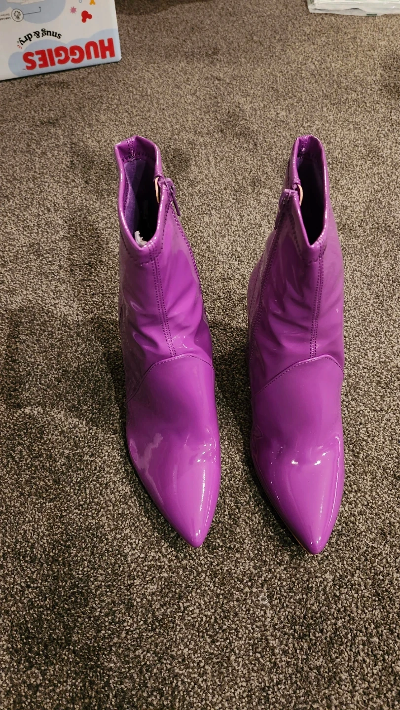 These eye-catching ankle boots feature a glossy purple patent finish. They have a pointed toe and a chunky block heel for a bold look. Side zippers for easy on and off.