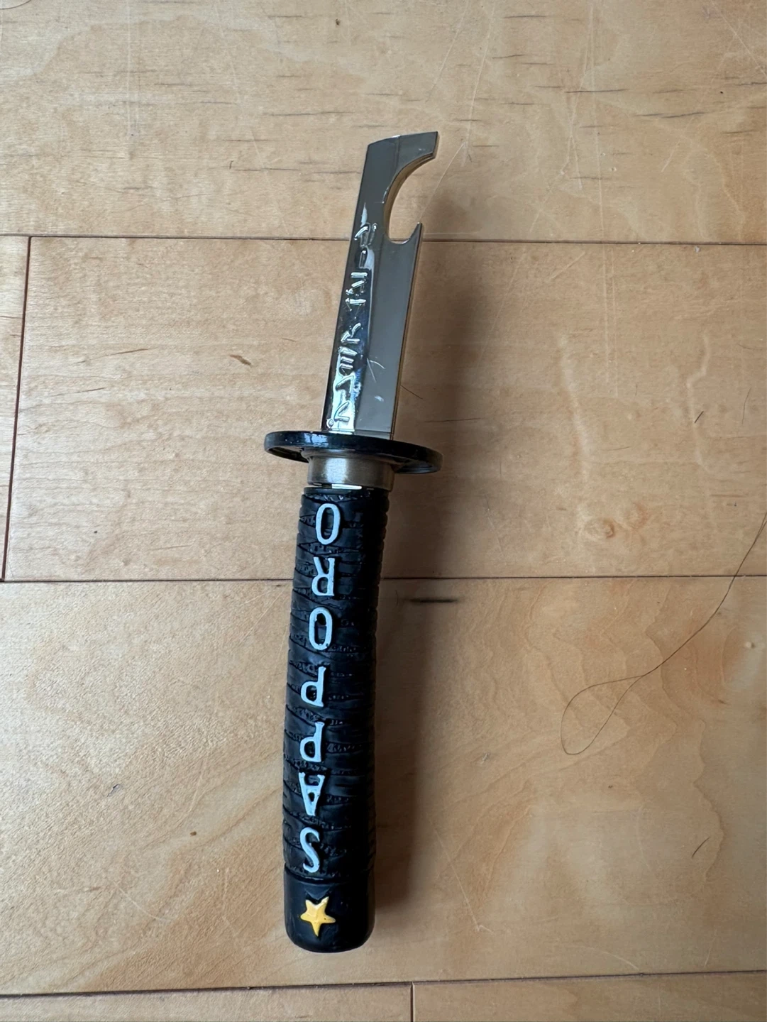 This is a cool bottle opener shaped like a mini katana. The handle has 'SAPPORO' written on it. It's a fun way to open your drinks! There’s some minor scratches on the katana but overall it is in good condition and it does the job.