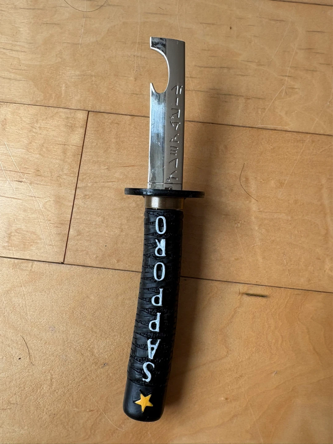 This is a cool bottle opener shaped like a mini katana. The handle has 'SAPPORO' written on it. It's a fun way to open your drinks! There’s some minor scratches on the katana but overall it is in good condition and it does the job.