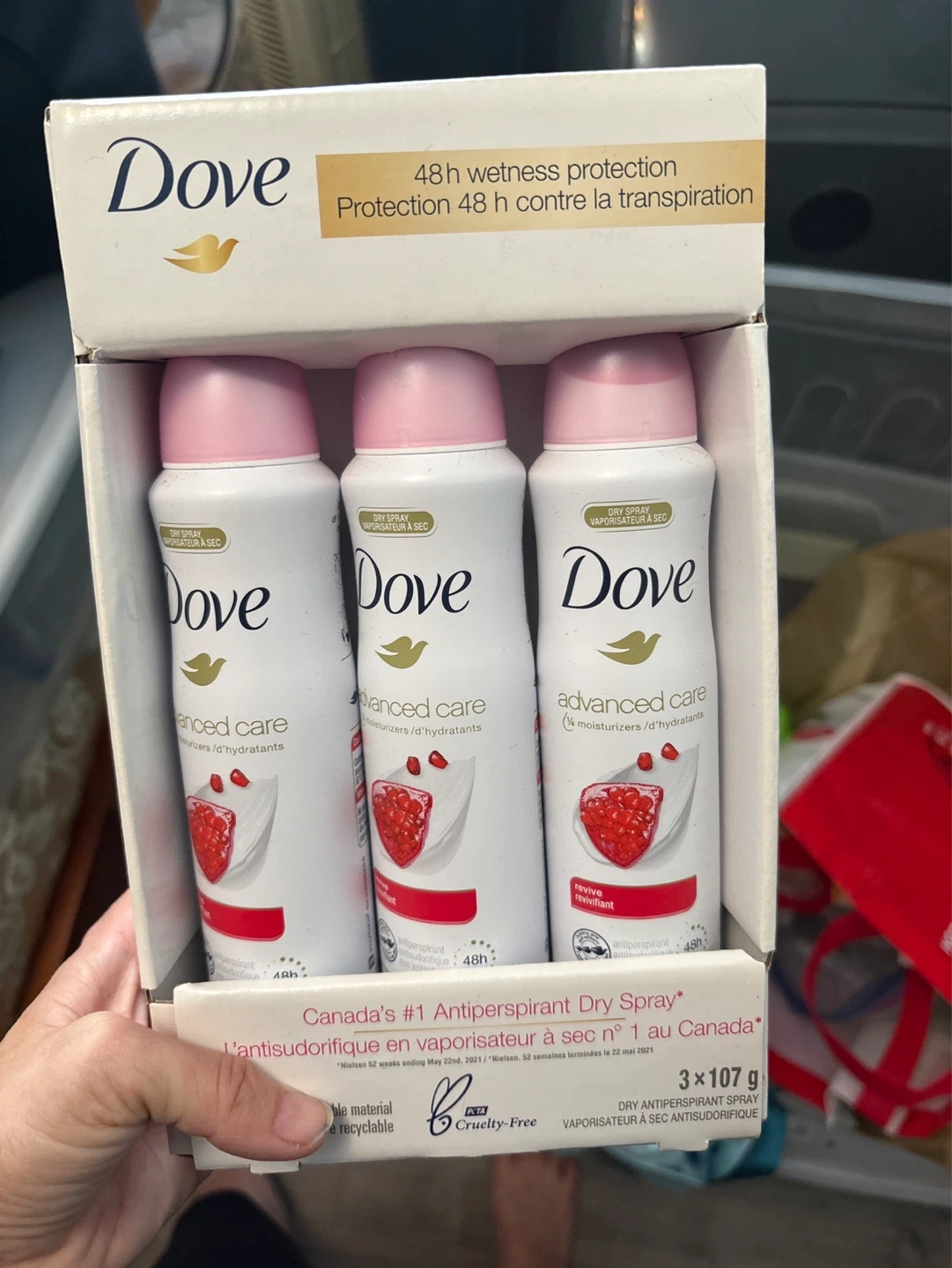 This is a 3-pack of Dove Advanced Care Antiperspirant Dry Spray. Each can contains 107g and provides 48-hour wetness protection. It's formulated with moisturizers.
