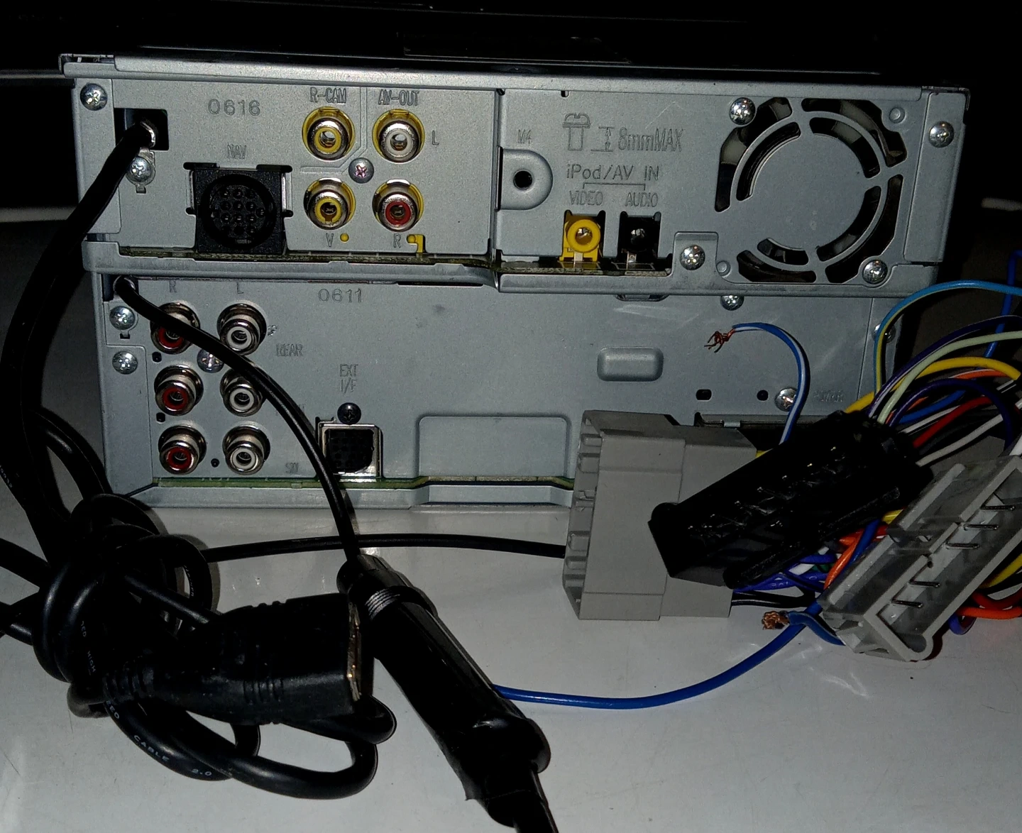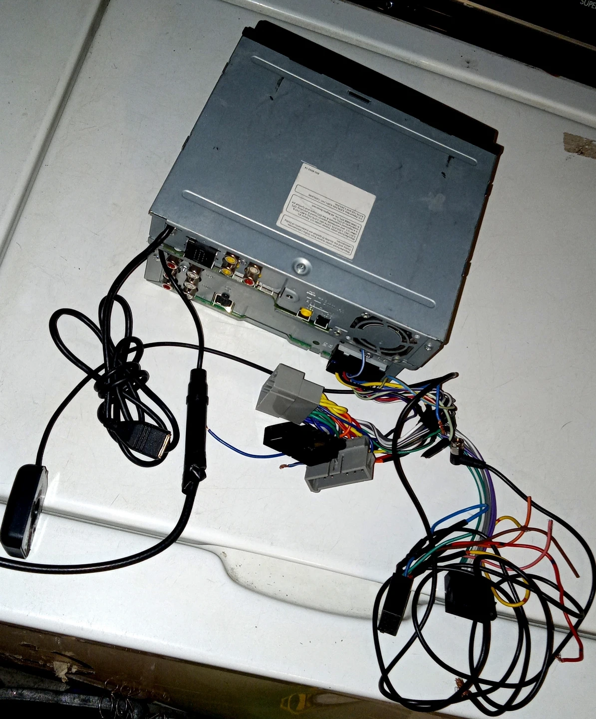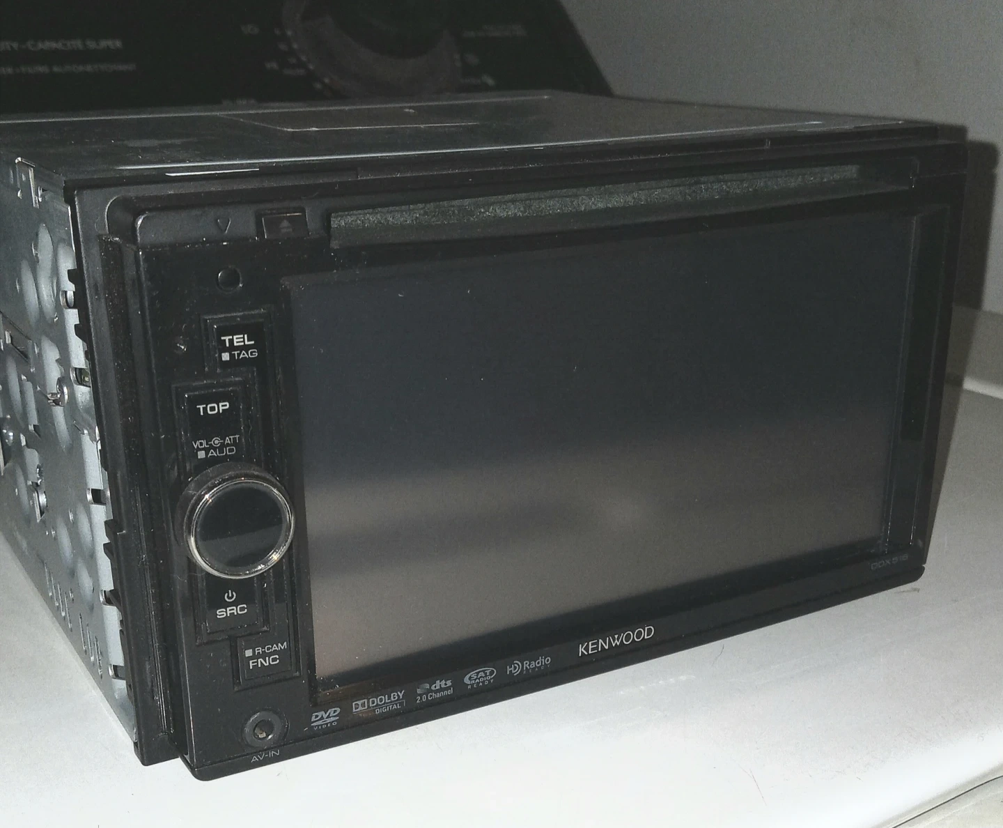 Kenwood DDX516 monitor DVD receiver with iPod/AV input. It supports DVD, Dolby Digital, DTS Digital Surround, and HD Radio. Includes wiring harness and power cable.