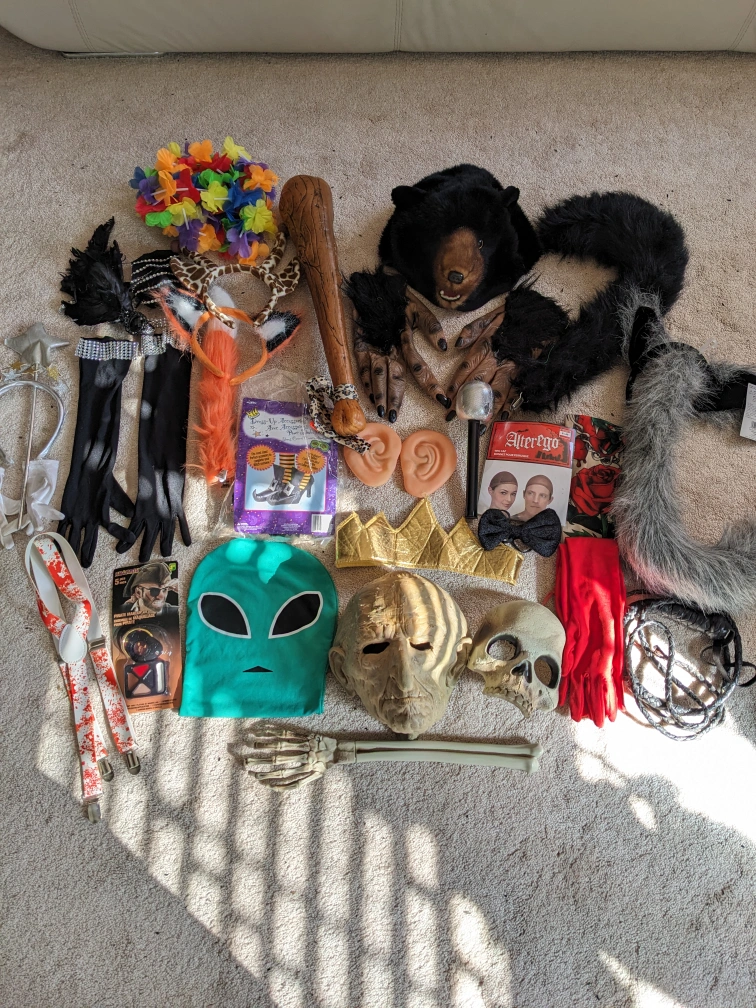 Each $5-$25, Costume ( adult size L- XL ), accessories, wigs, and full costumes. Includes:tail, and paws, alien mask, best gloves, pirate wig, , and more.