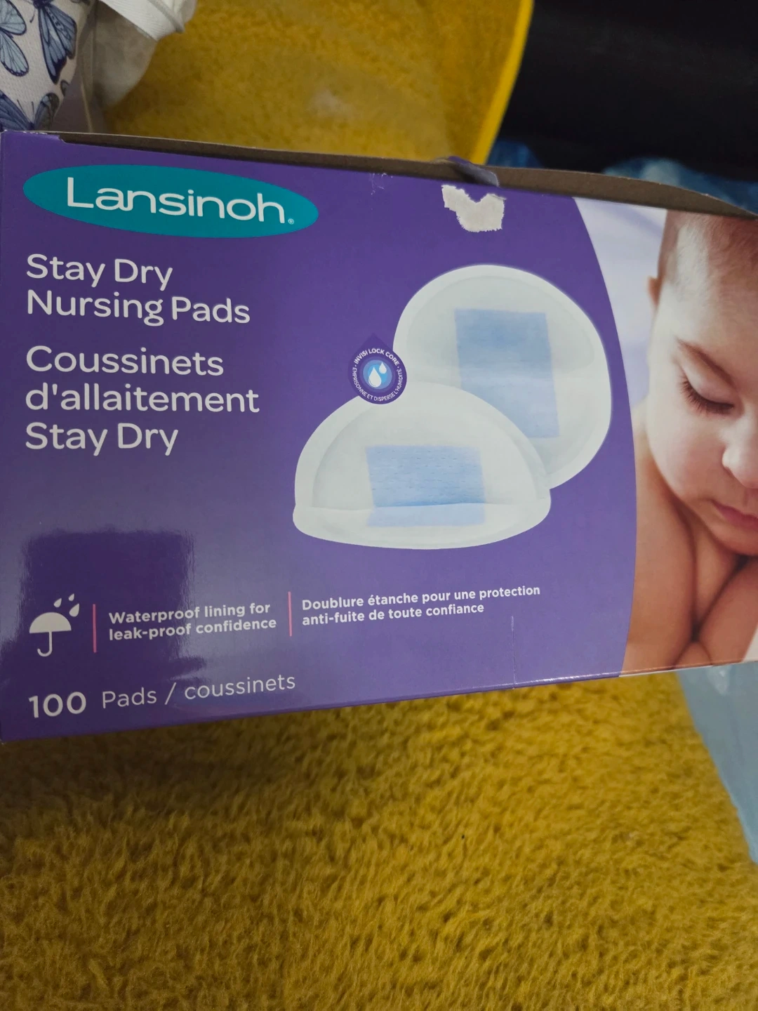 Selling a box of Lansinoh Stay Dry Nursing Pads. The box contains 100 pads, each with a waterproof lining for leak-proof confidence. They're designed to keep you feeling dry and comfortable