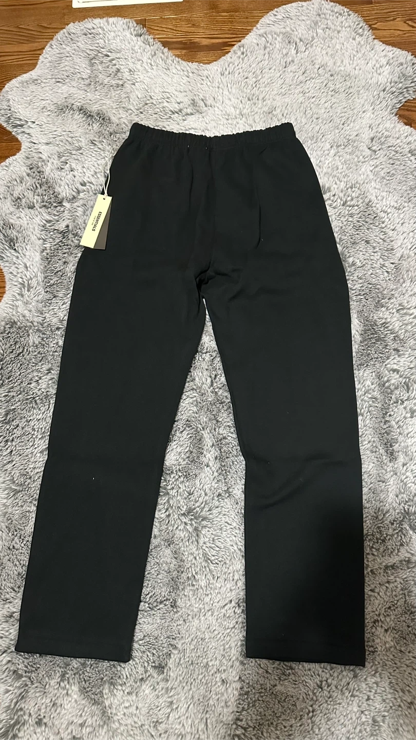 These are black sweatpants from Fear of God Essentials. They feature a drawstring waist and the brand's logo on the leg. Comfortable and stylish.