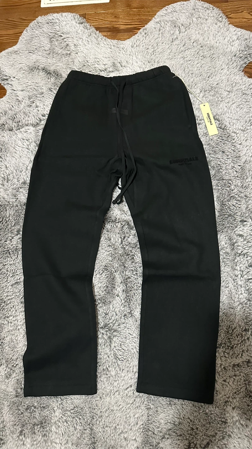 These are black sweatpants from Fear of God Essentials. They feature a drawstring waist and the brand's logo on the leg. Comfortable and stylish.