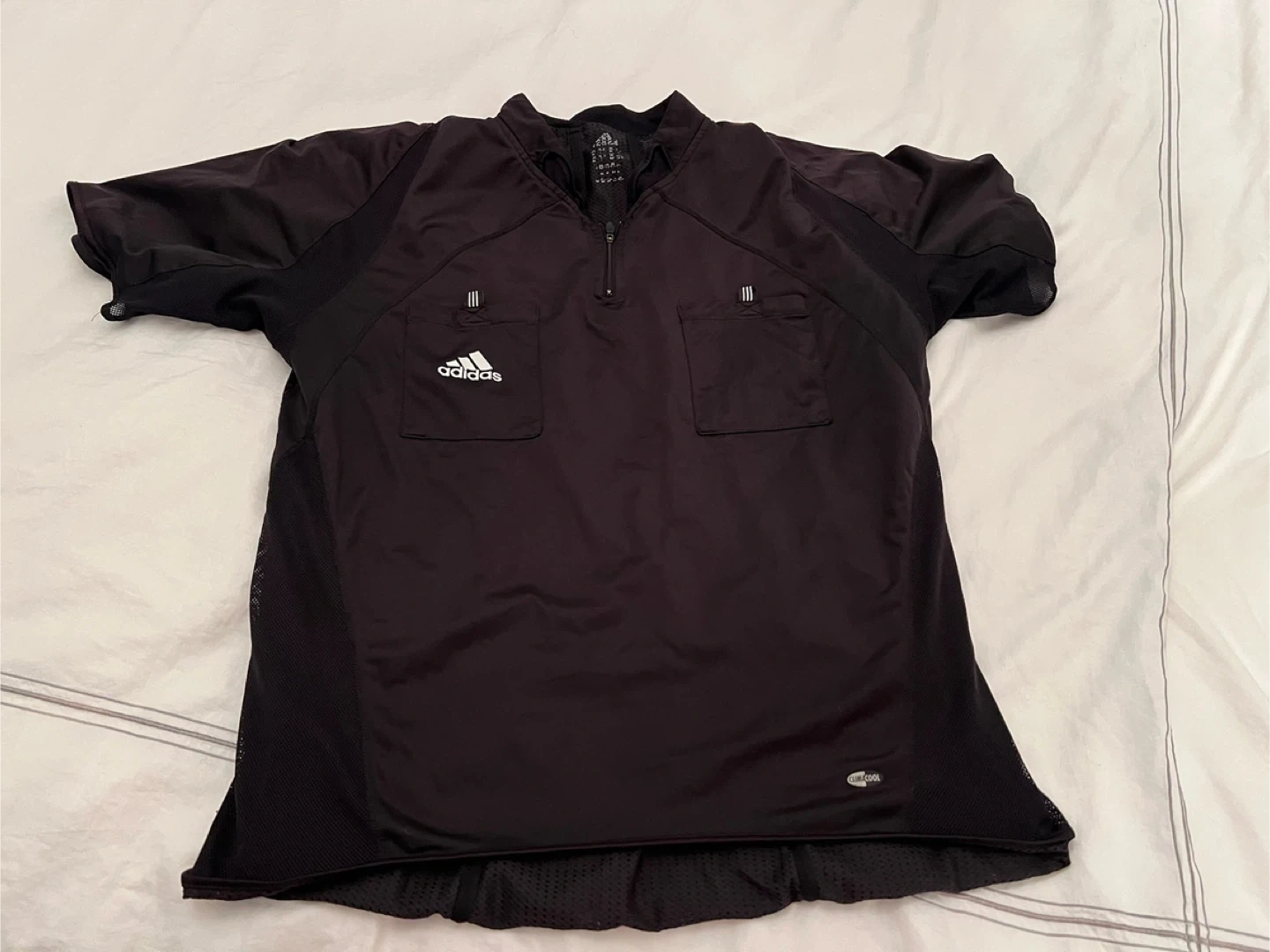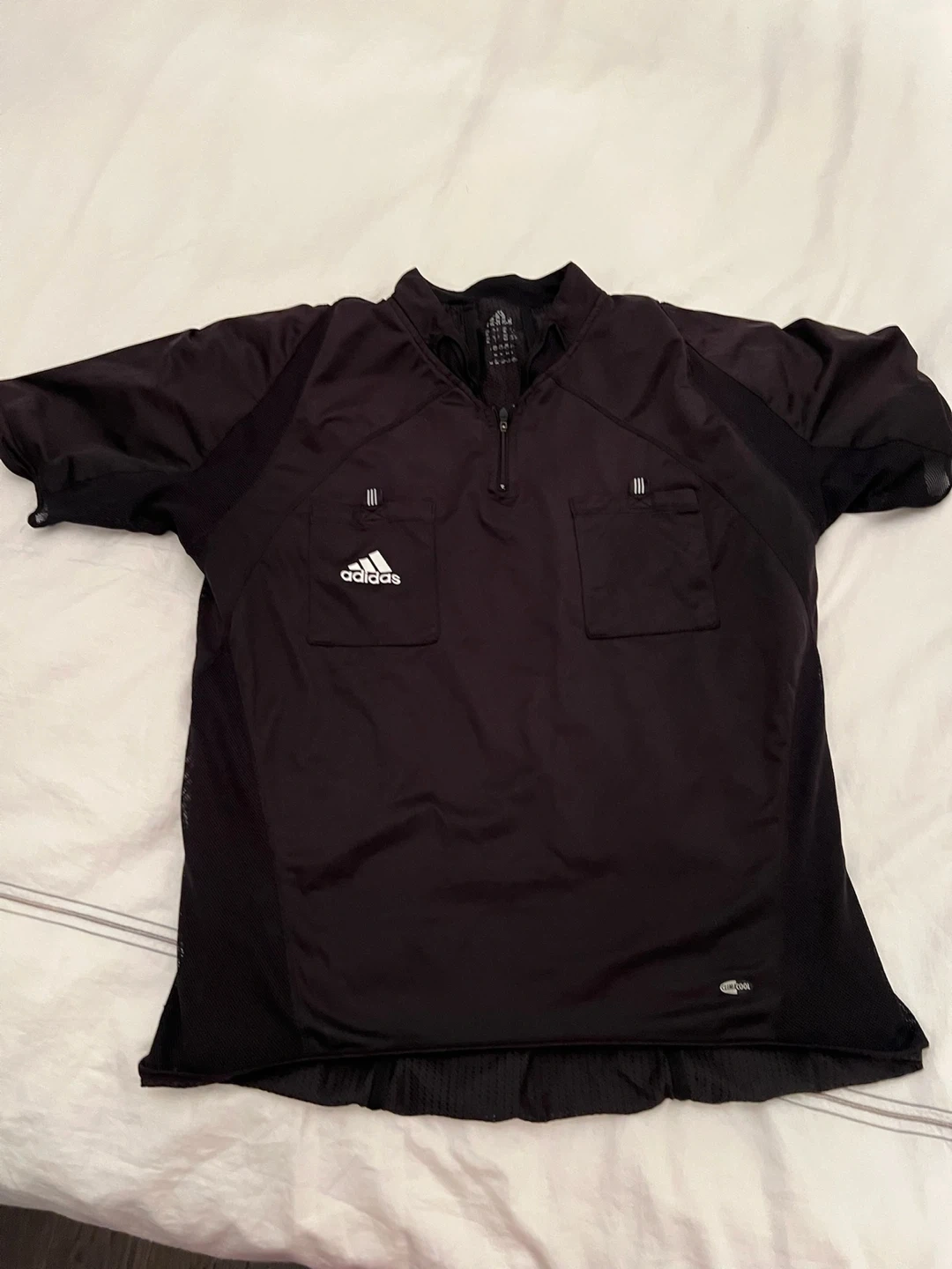 This is an Adidas short sleeve referee jersey. It's black with two chest pockets. Made with breathable fabric for comfort.