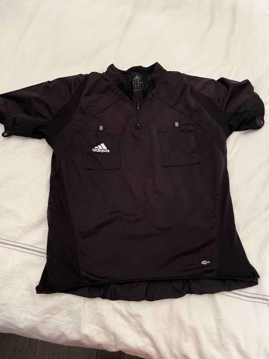 This is an Adidas short sleeve referee jersey. It's black with two chest pockets. Made with breathable fabric for comfort.