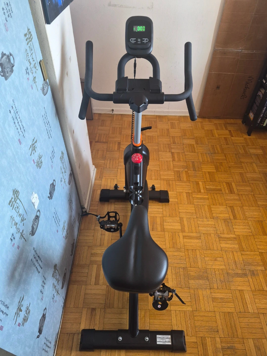 This is a Menoker exercise bike. It's great for home workouts. The bike has adjustable seat and handlebars for comfort. Well taken care of since it hardly got used. Silent Belt Drive, Heavy Flywheel, Comfortable Seat Cushion and Upgraded Digital Display. Barely used 🧡