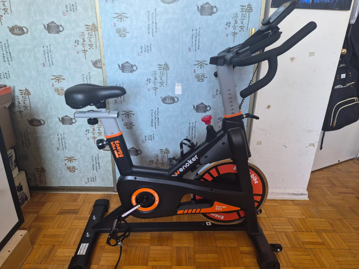 This is a Menoker exercise bike. It's great for home workouts. The bike has adjustable seat and handlebars for comfort. Well taken care of since it hardly got used. Silent Belt Drive, Heavy Flywheel, Comfortable Seat Cushion and Upgraded Digital Display. Barely used 🧡