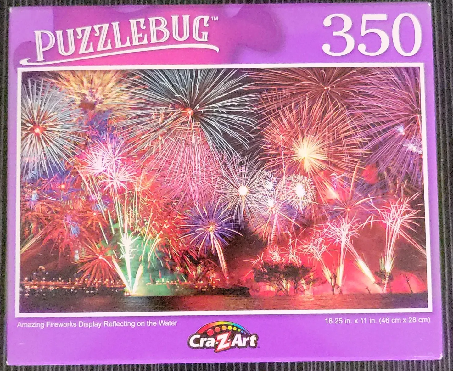 This is a Puzzlebug 350-piece jigsaw puzzle. It depicts an amazing fireworks display reflecting on the water. The finished puzzle dimensions are 18.25 in. x 11 in. (46 cm x 28 cm).