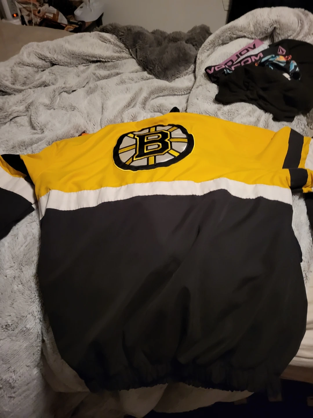 Yellow and black Boston Bruins pullover jacket. Features the Bruins logo on the back. It's a great way to show your team spirit!