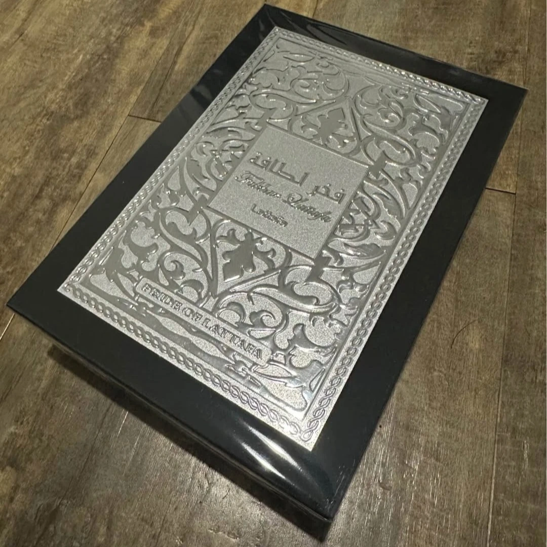 This is Lattafa Fakhr Al Lattafa Eau de Parfum. It's a 100ml bottle. The fragrance comes in an ornate black and silver presentation box.