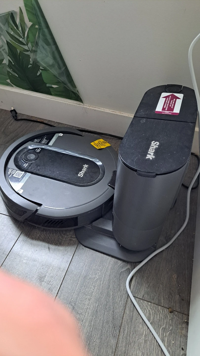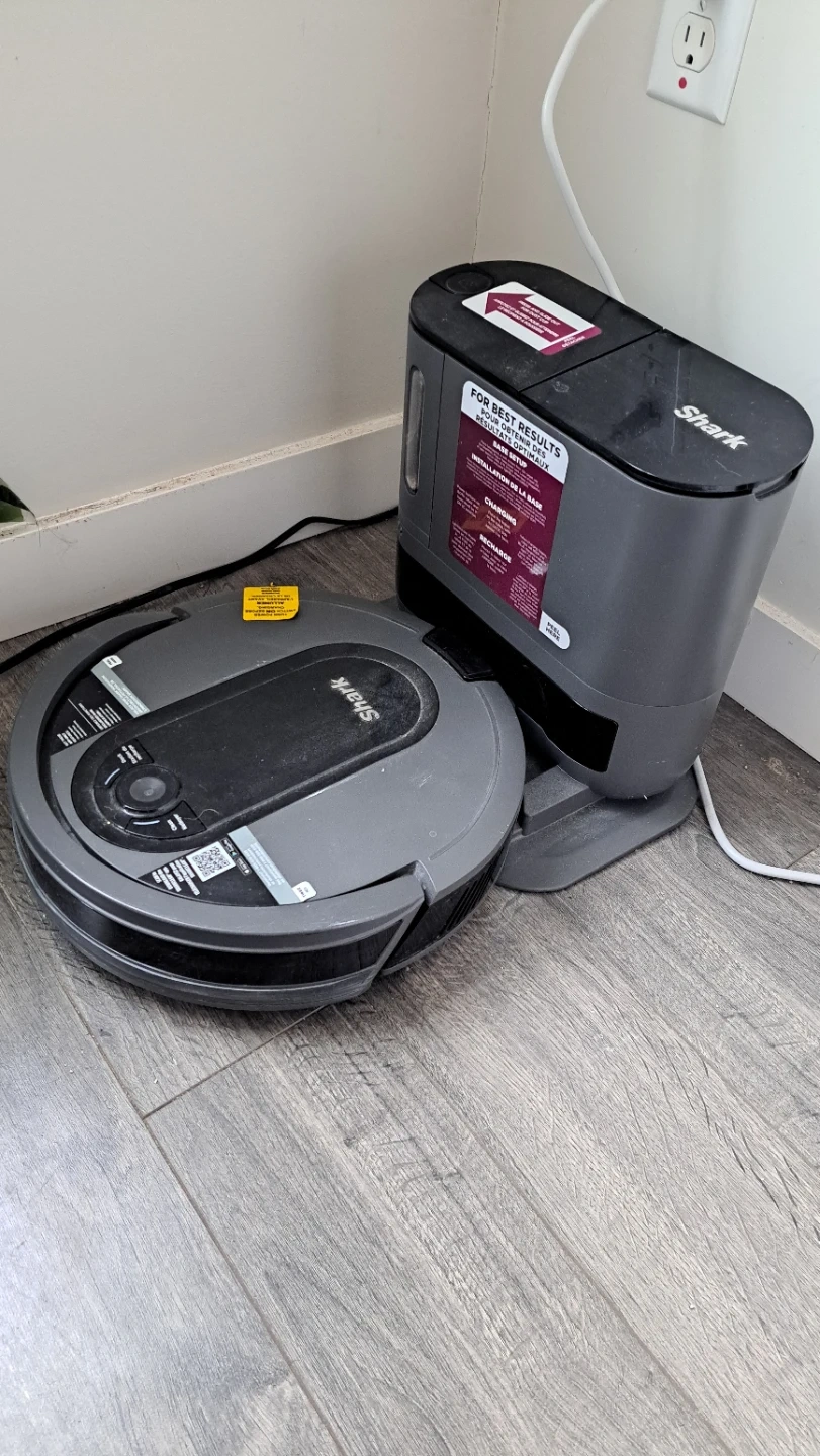 Shark robot vacuum with its self-empty charging base. Keeps your floors clean with automated vacuuming. The base automatically empties the vacuum's dustbin.