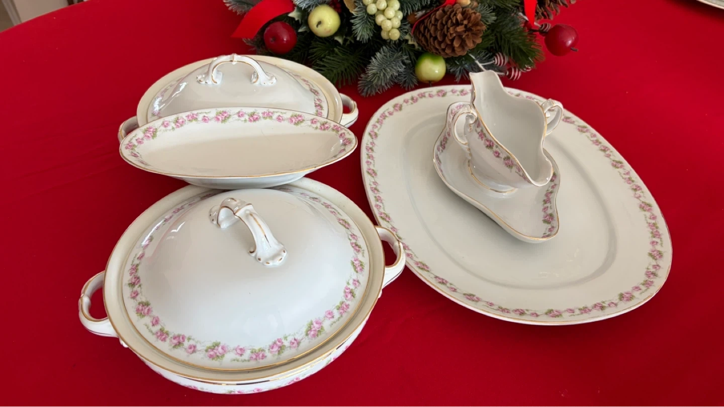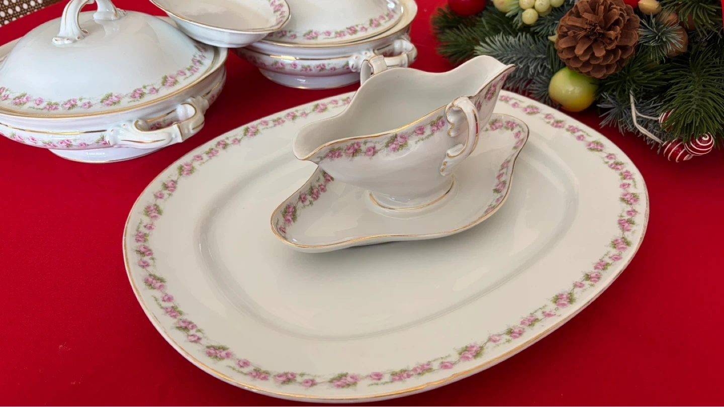 This elegant porcelain serving set features a delicate pink rose pattern with gold trim. It includes a large oval platter, a covered tureen, a serving dish, and a gravy boat with saucer. It's perfect for special occasions and holiday meals.
