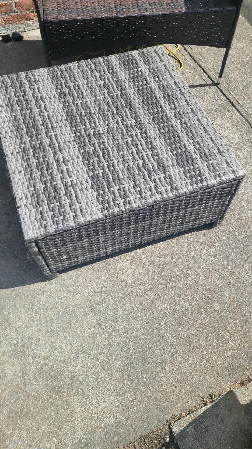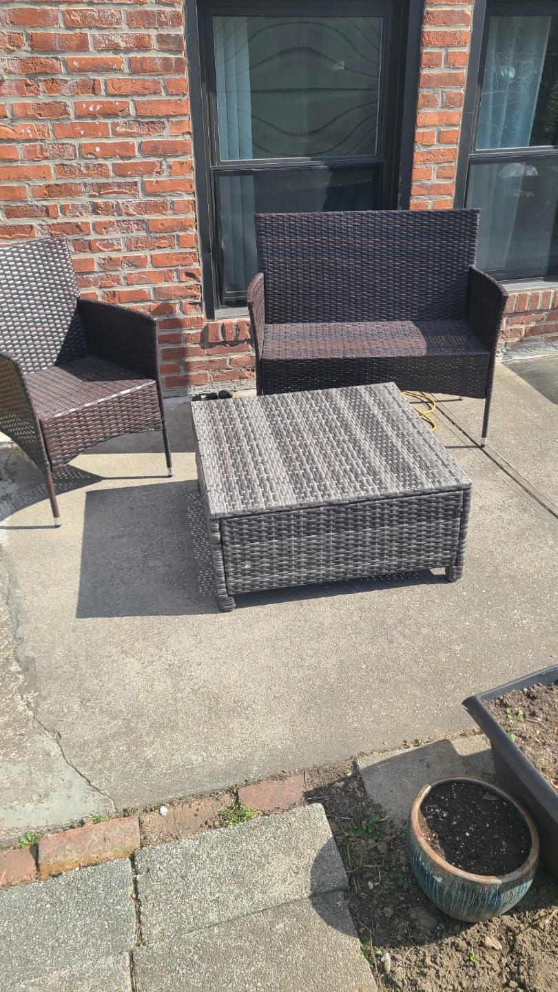 Brown and gray wicker patio furniture set. Includes one loveseat, one chair, and one coffee table. Perfect for outdoor seating area