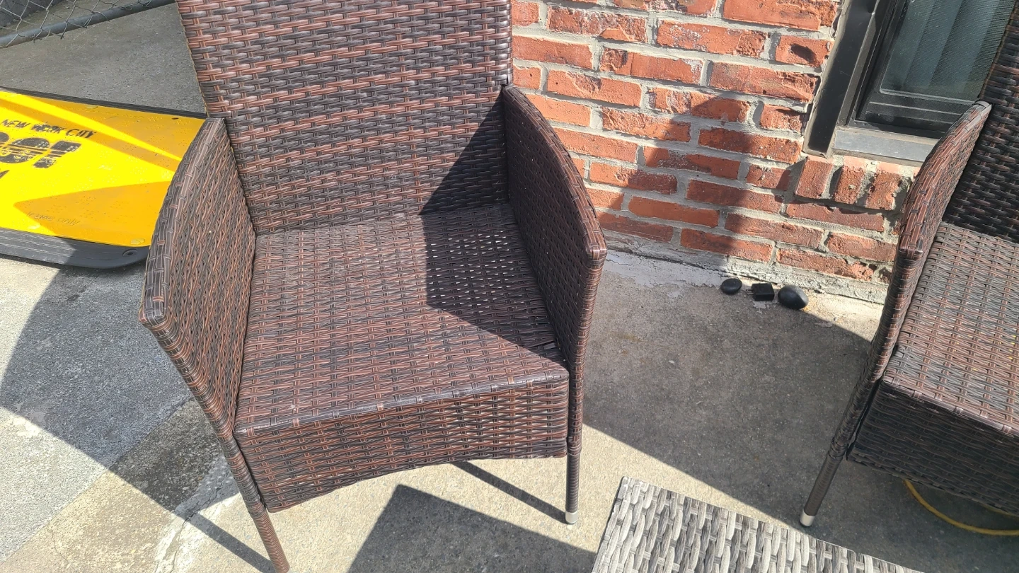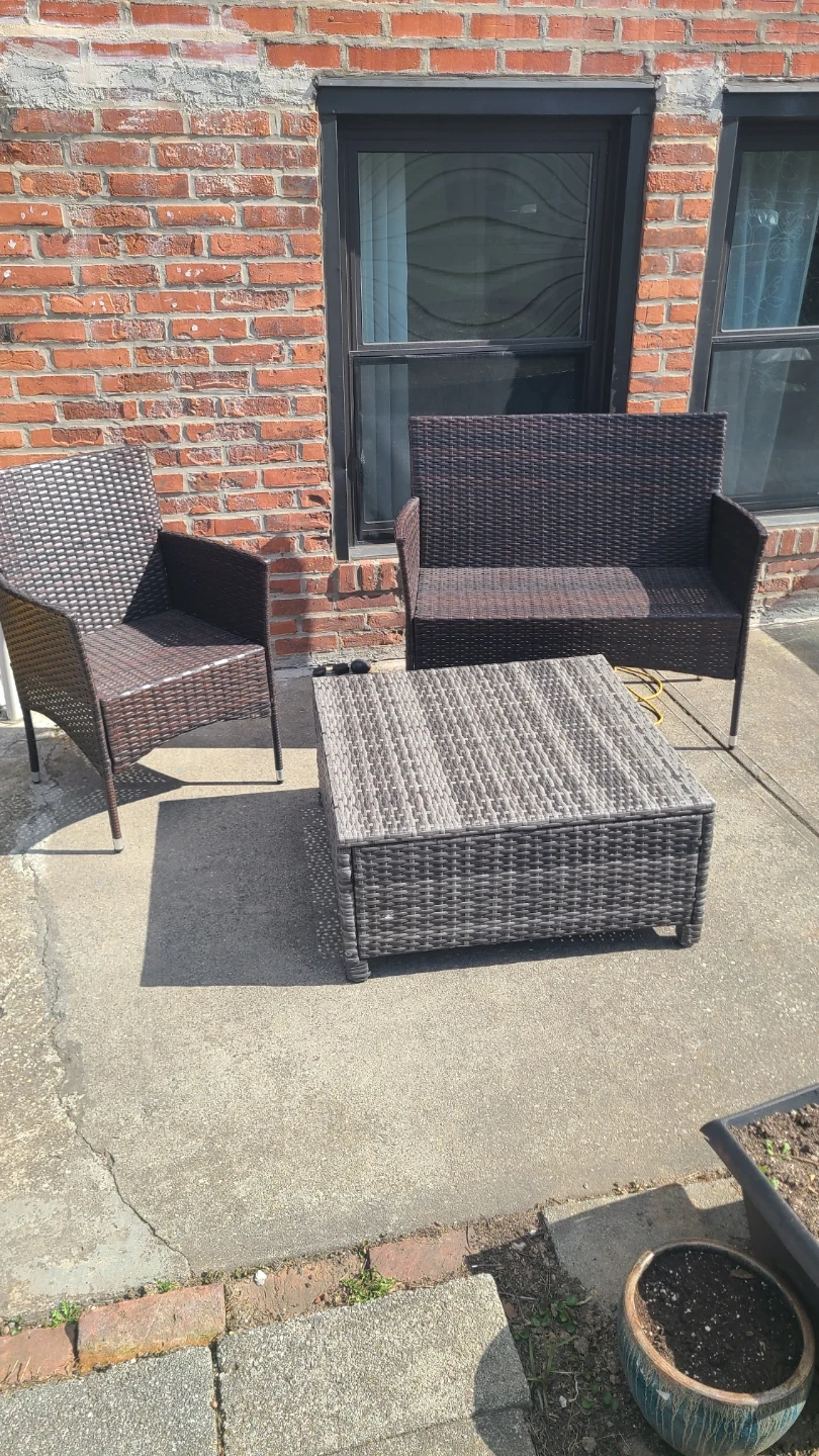 Brown and gray wicker patio furniture set. Includes one loveseat, one chair, and one coffee table. Perfect for outdoor seating area
