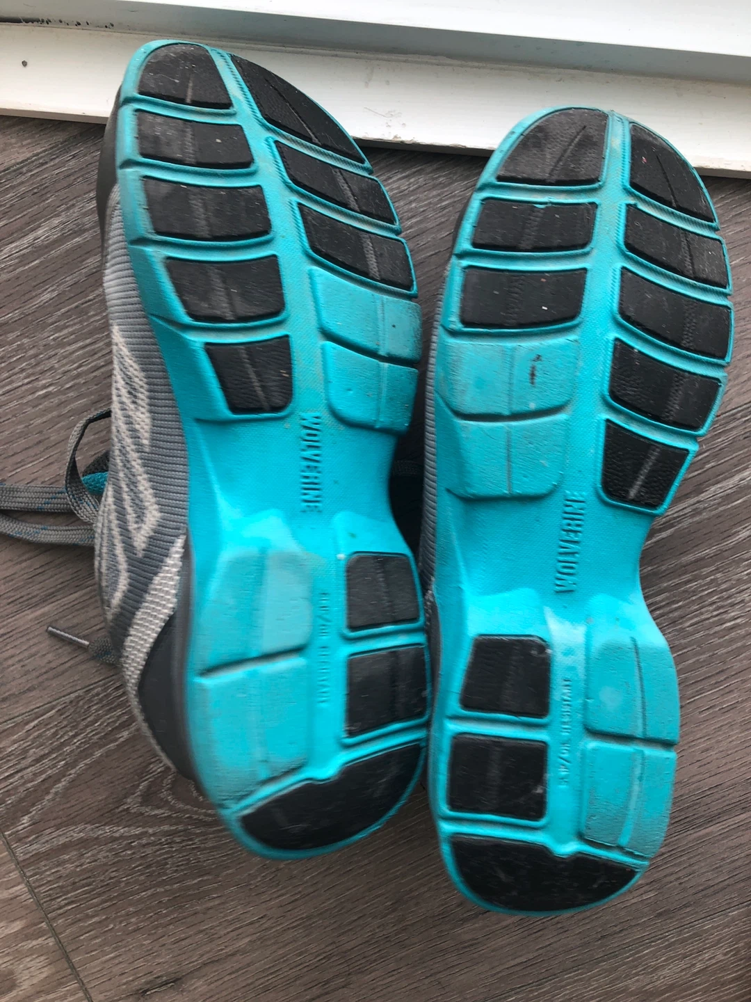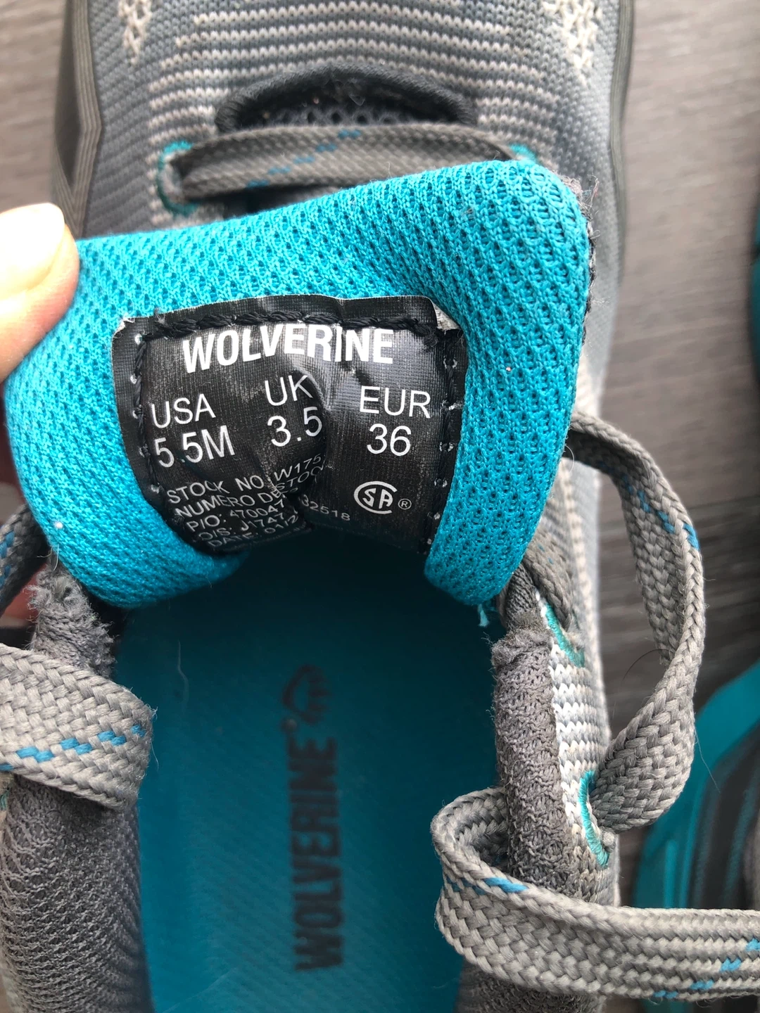 These Wolverine Steel toe shoes are grey and teal. They are a women's size 5.5 US, 3.5 UK, and 36 EUR. Mesh upper and rubber sole. Check out my other listings. Combo deals when buying multiple items.